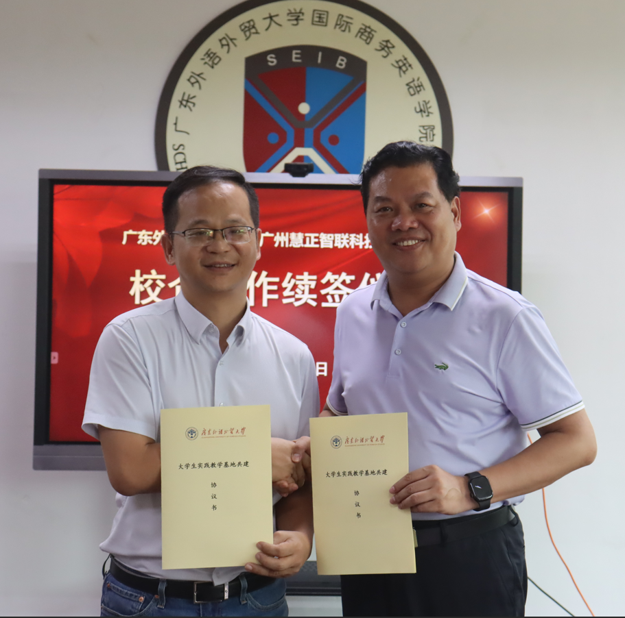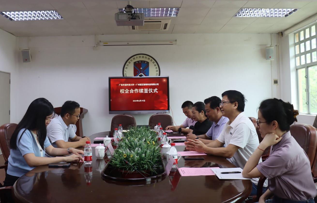 619日,广东外语外贸大学与广州慧正智联科技有限公司(以下简称“慧正智联”)校企合作续签仪式在我校白云山校区三教318会议室举行。学校教务部部长陈金诗,商英学院院长胡春雨、党委书记苏冬燕、副院长汪谓超,亚非学院副院长牛子牧,以及慧正智联CEO、我校97级校友郭喜鸿等参加此次仪式。