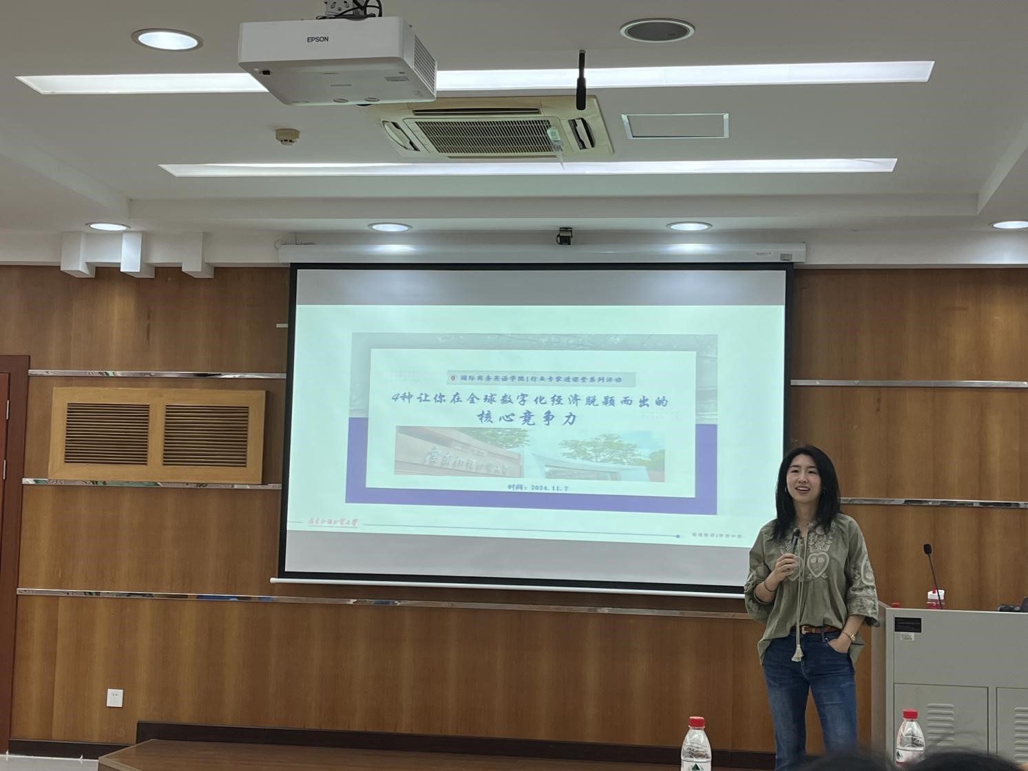 11月7日下午,商英学院在九教103报告厅成功举办 “行业专家进课堂系列活动”。本次活动聚焦 “4 种让你在全球数字化经济脱颖而出的核心竞争力” 主题,邀请了具有丰富国际实践经验的欧阳江岱女士担任主讲嘉宾,为学院师生带来了一场知识与经验交融的精彩讲座。