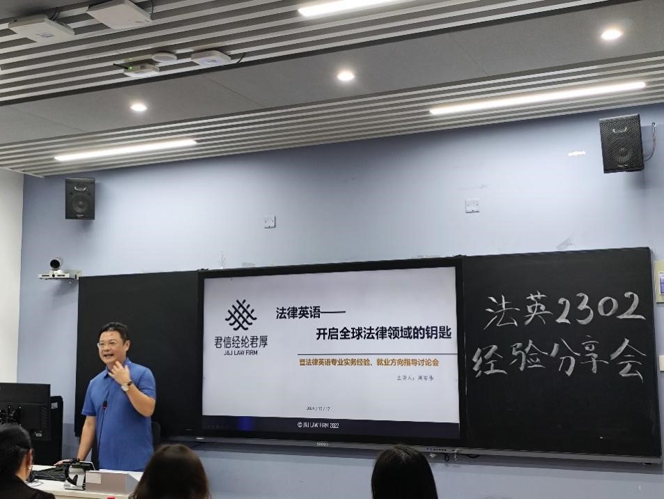 2024年10月17日晚上,商务英语(国际经济法)2302班(以下简称“法英2302班”)校外导师见面会暨学习经验分享会在一教南楼209教室顺利举行。国际商务英语学院党委杜焕君副书记、法英2302班校外导师周军伟律师、法英2302班班级导师谢静老师、2023级本科生辅导员赖志鹏老师及法英2302班朋辈导师吴婉琳出席此次会议。法英2302班同学参与此次见面分享会。