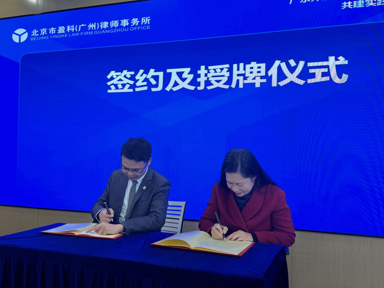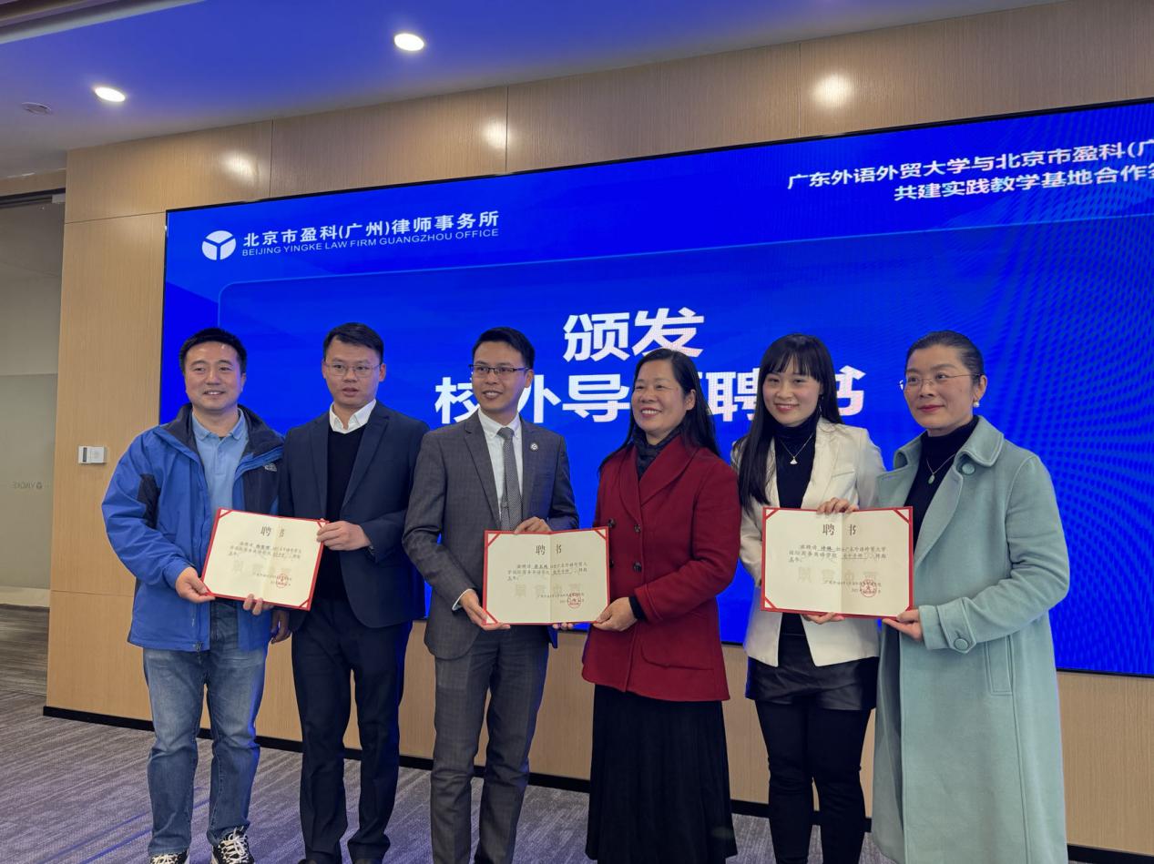 12 月 26 日,广东外语外贸大学国际商务英语学院与北京盈科(广州)律师事务所实践教学基地签约挂牌仪式与校外导师聘用仪式圆满举行。国际商务英语学院党委书记苏冬燕、副书记杜焕君、副院长汪谓超、法英系主任张新红、副主任徐优平等师生;盈科中国区董事、广州高级合伙人律师苏玉鸿、盈科广州高级合伙人律师谭红斌等人出席本次活动。