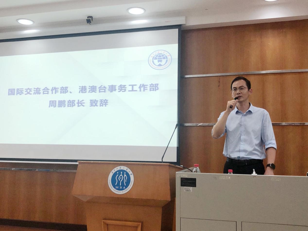 宣讲会上,国际交流合作部、港澳台事务工作部部长周鹏介绍了广外教育国际化战略,涵盖学生国际化、教学国际化、科研国际化与管理国际化等。周鹏提到,广外历来非常重视教育国际化,已与60个国家、488个高校和机构开展合作。疫情前,每年我校派出超过1000名学生到国(境)外交流、学习。周鹏结合个人学习、工作经历,号召青年学子“加入广外,走向世界”,希望青年学子“看世界、知世界、用国际视野为国家做出贡献”,并表示国际交流合作部会用心为学生提供指导、服务和帮助。