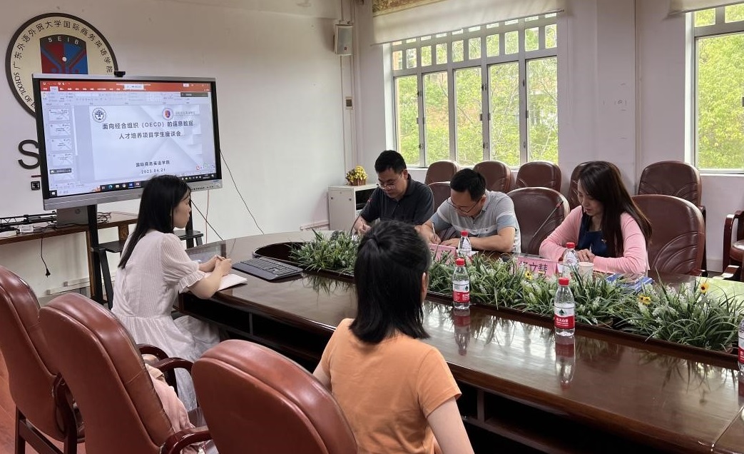 为推进面向经合组织(OECD)的信息数据人才培养项目实施、指导项目第一届学生申请国际组织实习岗位以顺利完成学业,4月21日下午,国际商务英语学院在三教318会议室,以线上线下结合的方式举办座谈会。研究生院副院长蒋涌教授、国际商务英语学院副院长杨文慧教授出席会议,国际治理创新学院优秀学子刘茜、刘子津受邀分享国际组织实习经验,项目第一、二届学生参加座谈会。国际商务英语学院国际项目中心韩金彪老师主持座谈会。