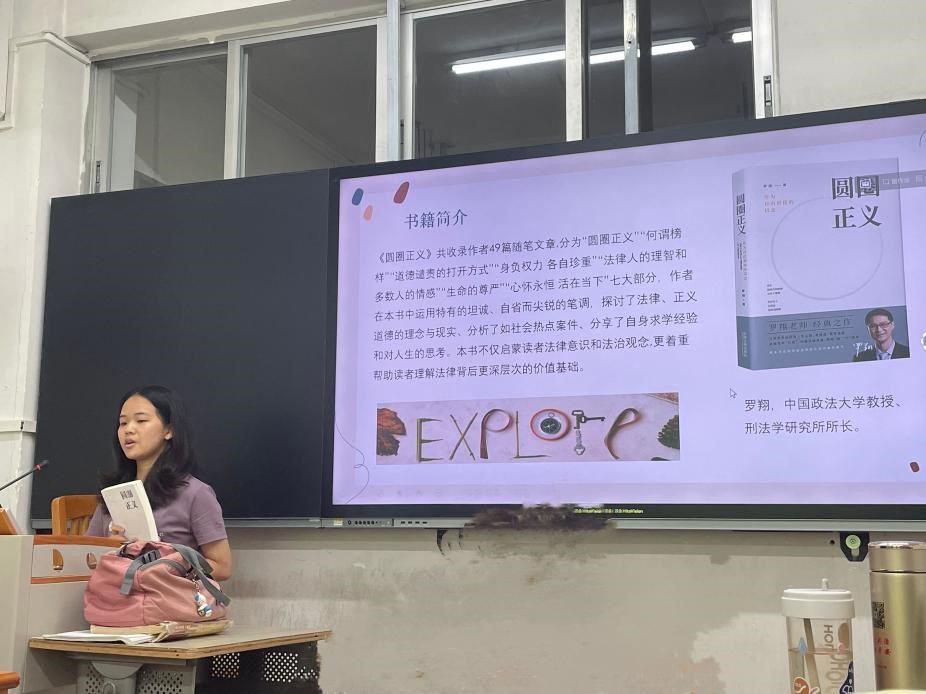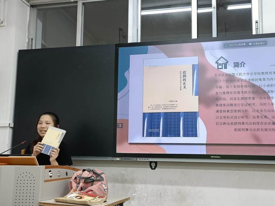 本学期的分享会中,每位同学都会就系里和任课教师推荐的图书分享自己的读书经验和读书报告。大家分享的书籍主题多样化,内容涵盖法律翻译、法律随笔、法律小说等诸多方面,从《西窗法雨》到《圆圈的正义》,从《洞穴奇案》到《迟到的正义》,还有指导法律翻译的专业书籍《法窗译话》等。大家在详细介绍书籍内容的基础上,对书籍中的精彩语句、经典译文和高亮情节进行了点评,无私地奉献了自己在书籍中的所学、所思、所悟。