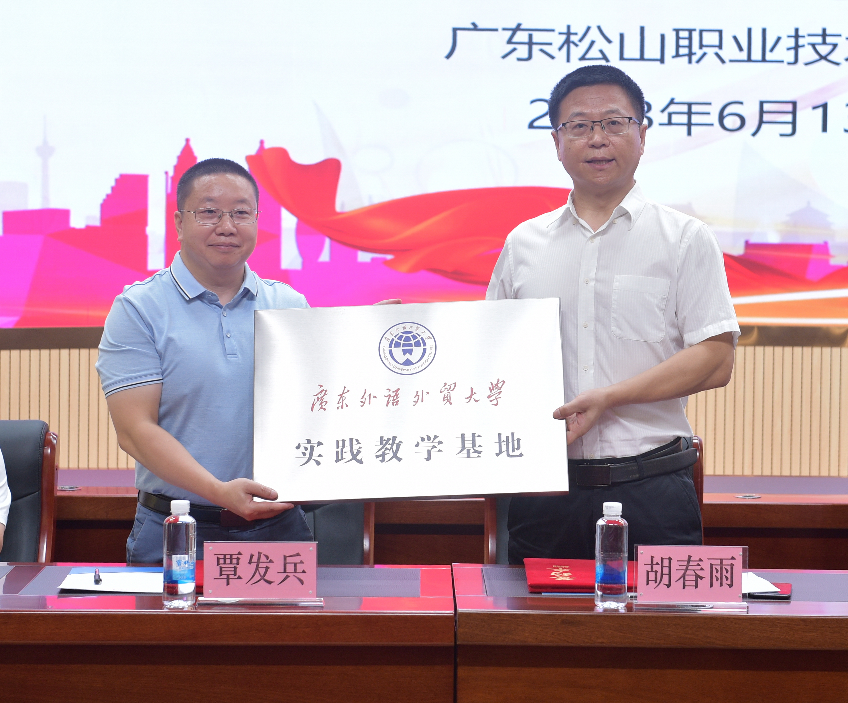 接着,胡春雨、覃发兵签订了《广东外语外贸大学实践教学基地协议书》,并举行广东外语外贸大学实践教学基地授牌仪式。