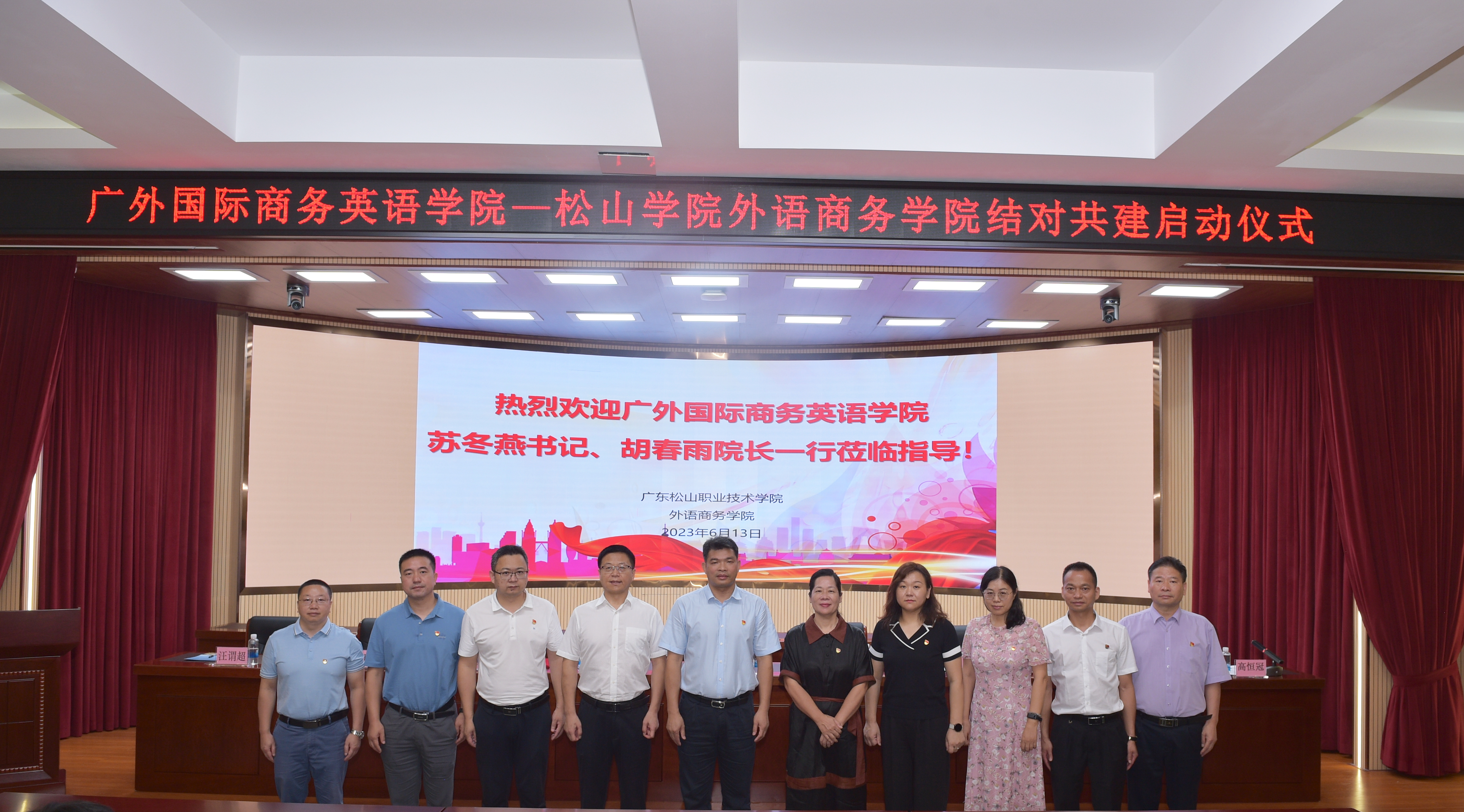 2023年6月13日,我院和广东松山职业技术学院结对共建启动仪式在广东松山职业技术学院曲江校区学术报告厅举行。广东松山职业技术学院党委副书记张林茂,学校党委委员、组织宣传统战部部长洪明刚、外语商务学院党总支书记高贺、主持工作副院长高恒冠、党总支副书记黄仁强、教务部挂职副部长覃发兵、我院党委书记苏冬燕、院长胡春雨、副院长刘平、副院长汪谓超、党委组织员魏煊以及广东松山职业技术学院外语商务学院近100名师生代表参加了该活动。