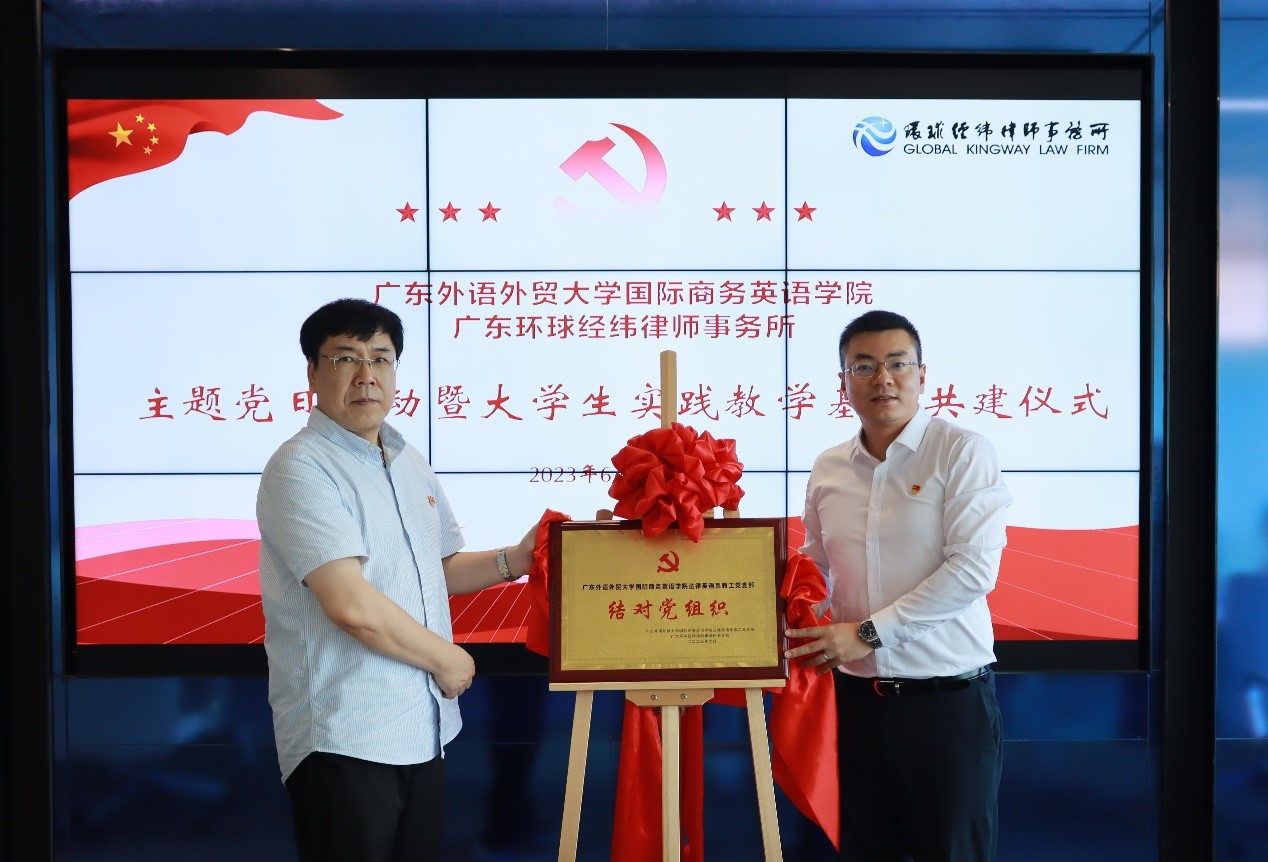 为推进学习贯彻习近平新时代中国特色社会主义思想主题教育走深走实,加强基层党组织建设,深化校企合作,6月30日,我院联合广东环球经纬律师事务所(以下简称“环球经纬”)举行党建共建及大学生实践教学基地签约揭牌仪式。我院党委委员、副院长汪谓超,法律英语系教工党支部书记张新红、辅导员万东方,环球经纬党支部副书记张晓龙,党支部委员赵崇鹤,党员律师熊继博、任萍、何铭贤、实习律师林虹等出席签约揭牌仪式。仪式由环球经纬高级合伙人,我院2007级校友陈晖主持。