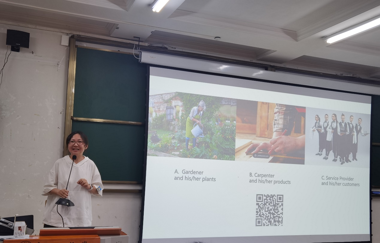 郝佳老师以心理学教授的著作《The gardener and the carpenter》为切入点,将园丁和木匠作为教育中的身份隐喻,与老师们探讨教师身份角色。同时介绍智慧树、雨课堂等教育互动方法,分享鼓励学生发言的课堂经验。