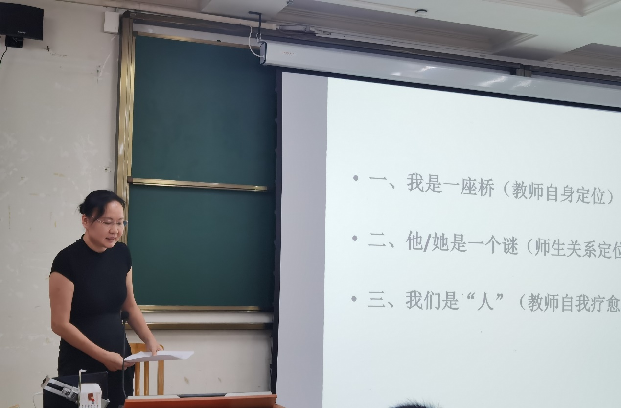 优秀教师代表陈潇潇、郝佳、卢楠、彭娜老师依次上台进行教学经验分享。陈潇潇老师从我是一座桥(教师自身定位)、他/她是一个迷(师生关系定位)、我们是“人”(教师的自我疗愈机制)三个方面进行分享,提出老师要及时答疑解惑,察言观色,关注学生细节所体现的身体和心理状态,保持开放的心态接受学生带来的新事物。与此同时,老师的健康也很重要,作为老师要学会自我调节,保持身心愉悦才能给学生积极正面的影响。