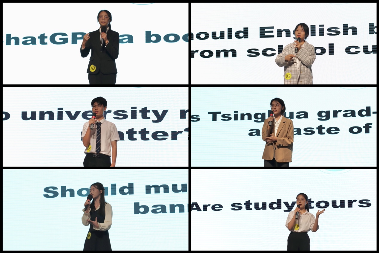 紧接而来是动人心弦的即兴演讲环节。晋级的8位本科生和3位研究生选手有的着眼于Chat GPT的发展,有的以成绩排名为出发点,阐述其必要性。还有的选手将学校结合专业进行对比分析,分享自己的见解看法。即兴演讲体现了选手们知识的广度、思想的深度,展现广外学子极强的语言表达能力和随机应变反应能力。