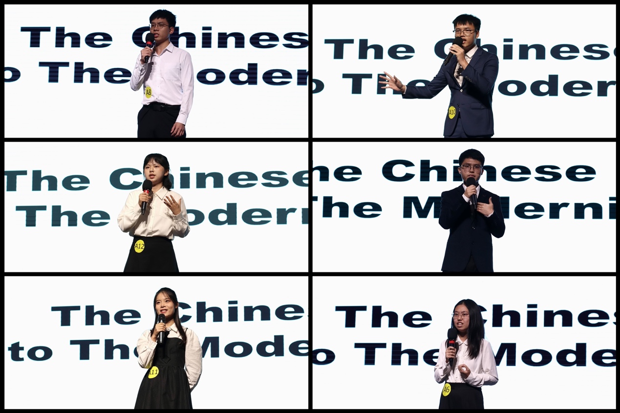 比赛第一轮为命题演讲,主题为“The Chinese Path to Modernization,演讲之后接受评委提问,这一轮不仅考验选手的表达能力,更考验选手的思辨能力。15位选手们(12名本科生、3名研究生)的演讲内容深刻与中国实际相结合,从医疗、脱贫攻坚、中国梦等角度切入,分享自己的独特见解。各位选手都生动形象地讲述了自己的观点,有些选手结合故事阐述,引起观众广泛共鸣。