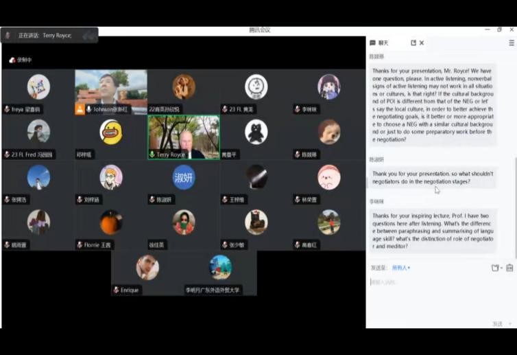 2023年10月19日晚七点,商英学院云山讲座教授、澳大利亚悉尼理工大学Terry Royce教授为法律语言学方向师生带来“法律语言学系列讲座”第一讲。该讲座以线上形式进行,由商务英语学院法律英语系主任张新红老师主持,文科基地袁传有教授、法律英语系张少敏老师以及法律语言学硕士和博士研究生积极参加了本次讲座。