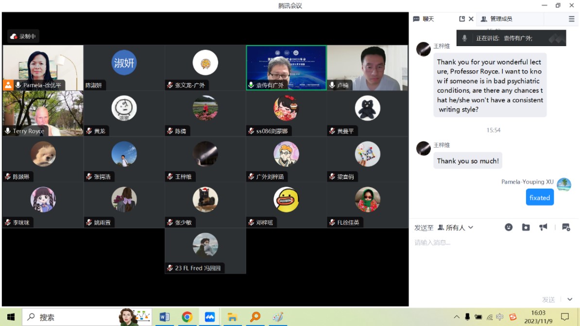 在问答环节,参会者们根据各自的兴趣并结合讲座内容积极提问。例如,大家就fixated一词的理解展开了。针对这些问题,Royce教授给予了详细的回答,使大家受益良多。最后,袁传有教授作总结发言,对Royce教授带来的精彩讲座表示衷心地感谢,勉励同学们立足法律实践、学好理论,服务社会。至此,由Terry Royce教授主讲的商英云山讲座“法律语言学系列讲座”第四讲正式结束。