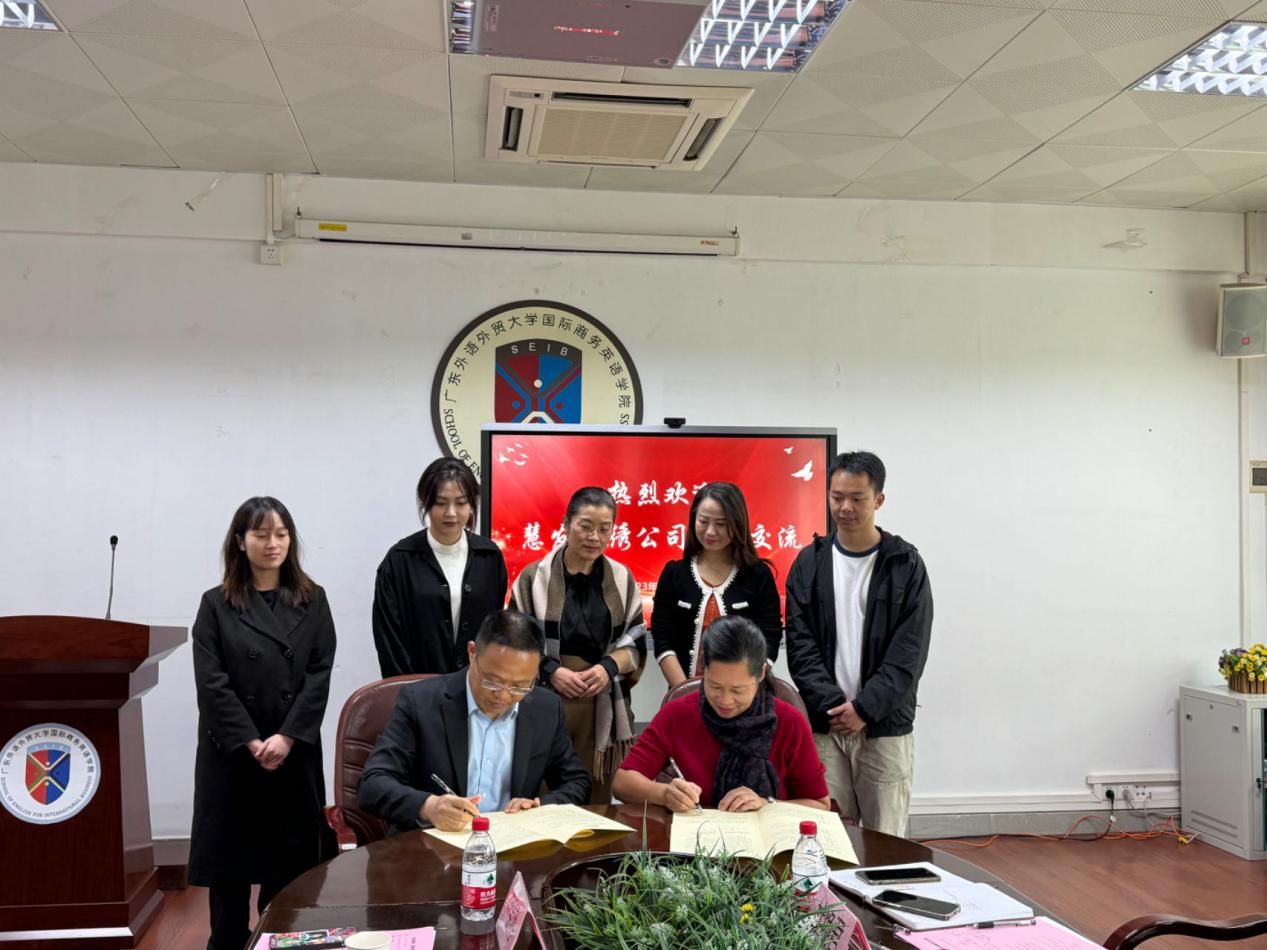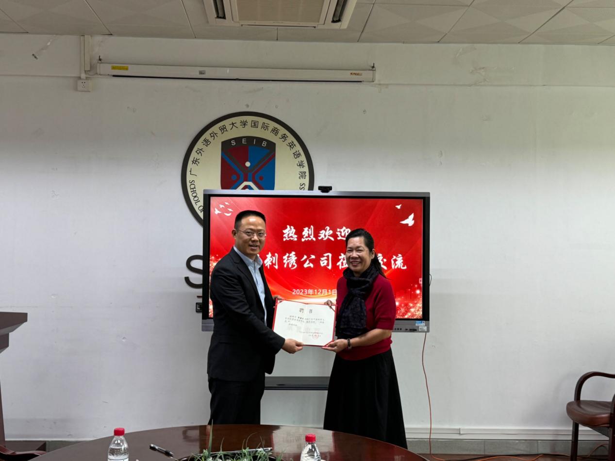 交流结束后,正式举行商英“筑梦·圆梦”捐赠签约仪式和校外导师聘用仪式,苏冬燕书记和李善兵董事长分别作为广外和慧发刺绣公司代表签署捐赠协议。本次捐赠的十万元将纳入商英筑梦基金,主要用于学院人才培养、学科发展、人文关怀等各个方面,由“商英筑梦”基金管理委员会管理使用,并定期公开使用情况。