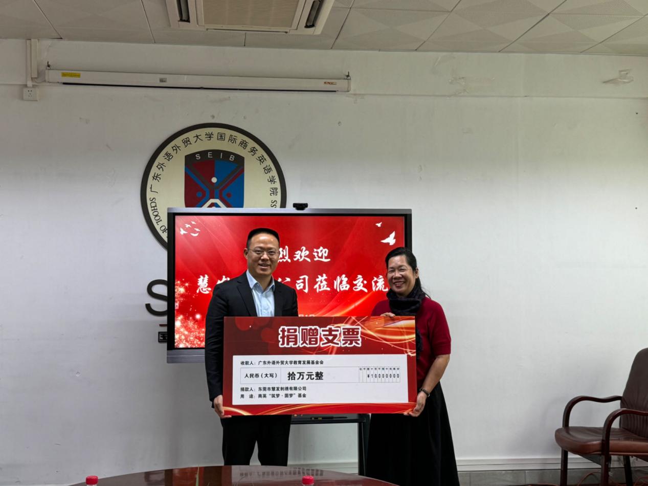 2023年12月1日上午,东莞市慧发刺绣公司向我院“筑梦·圆梦”基金捐赠10万元,捐赠仪式在学院318会议室举行。商英学院党委书记苏冬燕、党委副书记杜焕君、副院长杨文慧、辅导员钟坤;东莞市慧发刺绣有限公司董事长李善兵、总经理孔辛媛等人出席本次仪式。