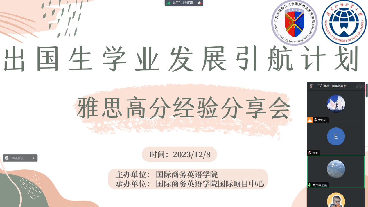 为帮助学生了解雅思考试、制定有效学习备考计划,为升学、出国深造做准备,12月8日晚,学院国际项目中心组织举办“出国生学业发展引航计划”之雅思高分经验分享会,邀请取得雅思高分的学长学姐,为正在备考雅思的出国生同学分享经验。国际商务英语学院副院长杨文慧教授、国际项目中心丛瑾、韩金彪老师,以及方若琳、揭一洪天、罗今希三位分享嘉宾出席会议,学院2022和2023级全体国际本科生、24期广外-昆士兰大学硕士班同学以及已报名25期广外-昆士兰大学硕士班同学参加会议。会议由国际项目中心韩金彪老师主持。