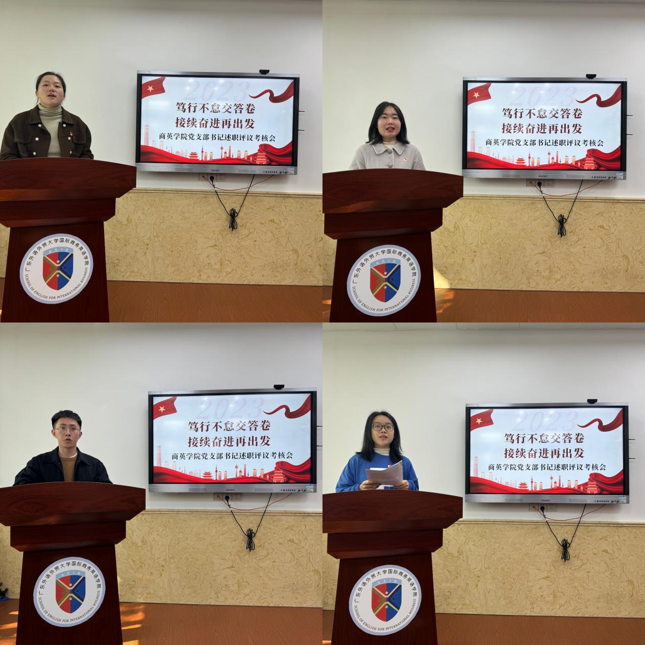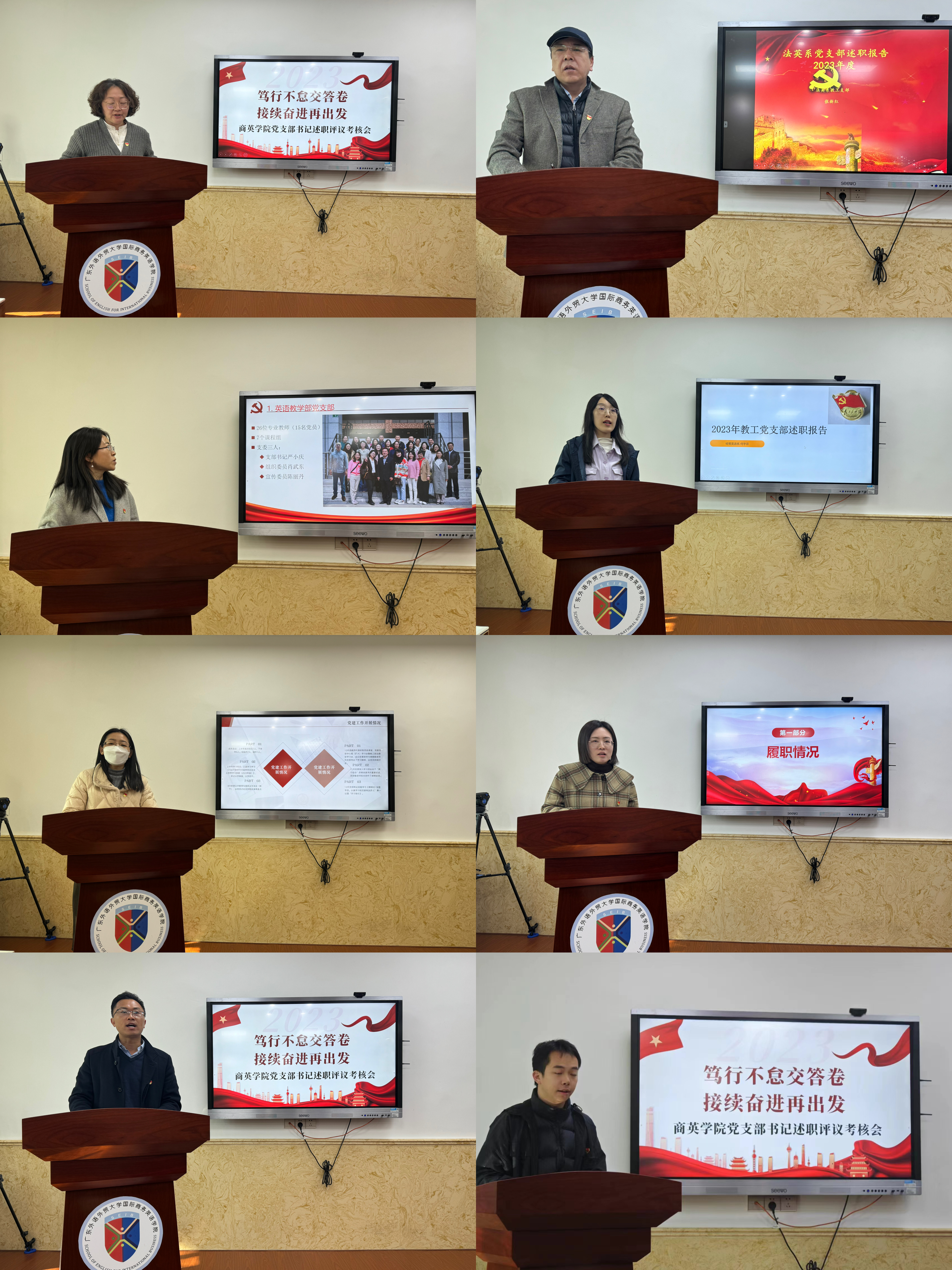 为深入实施新一轮基层党组织建设“三年行动计划”,进一步增强商英学院各党支部书记工作水平和履职能力,及时掌握支部书记作用发挥情况,推动学院基层党建工作长足发展。12月28日,商英学院党委于3教317会议室举行2023年度党支部书记述职评议考核会。学院党委书记苏冬燕、副书记杜焕君、副院长杨文慧、副院长汪谓超、各党支部书记出席本次会议。会议由副院长汪谓超主持。