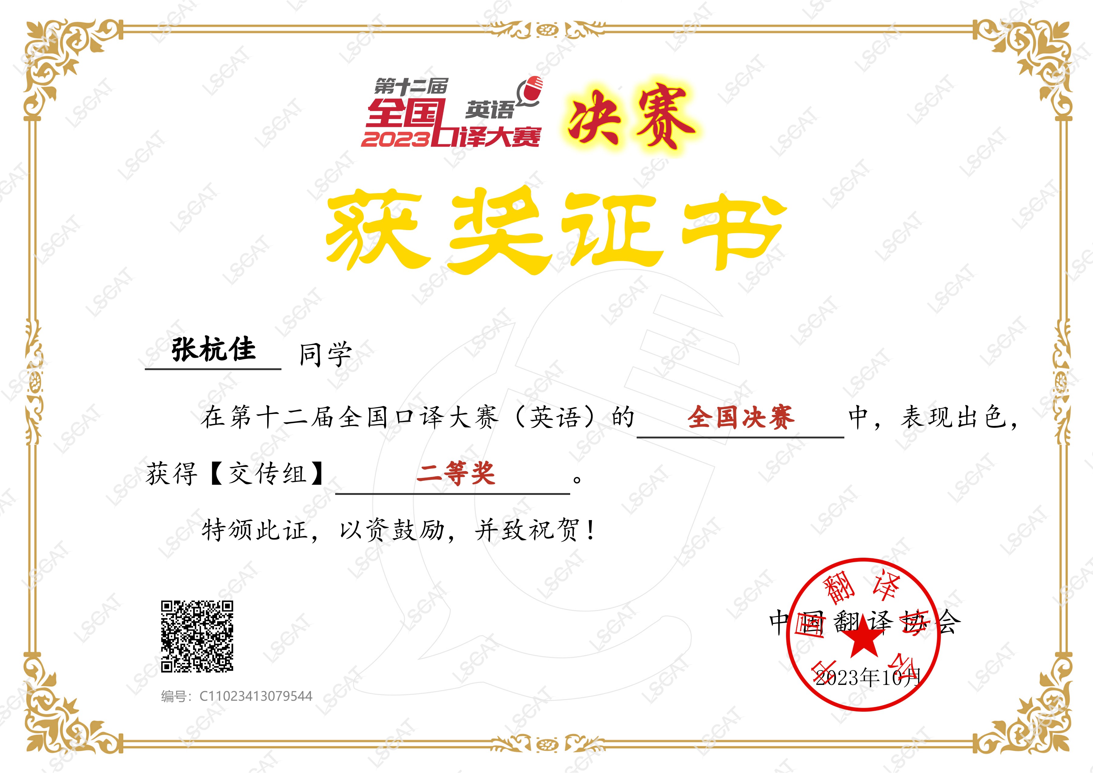 本网讯 2023年12月9日,由中国外文局指导,中国翻译协会、当代中国与世界研究院联合主办的第十二届全国口译大赛(英语)于北京举行。此次比赛中,我校国际商务英语学院2019级商务英语(国际经济法)专业本科生张杭佳同学从5月开始,历经全国初赛、复赛、决赛淘汰赛的激烈角逐,在商英学院法律英语系余蕾老师的指导下,顺利晋级全国总决赛现场赛,荣获交替传译组国家二等奖。