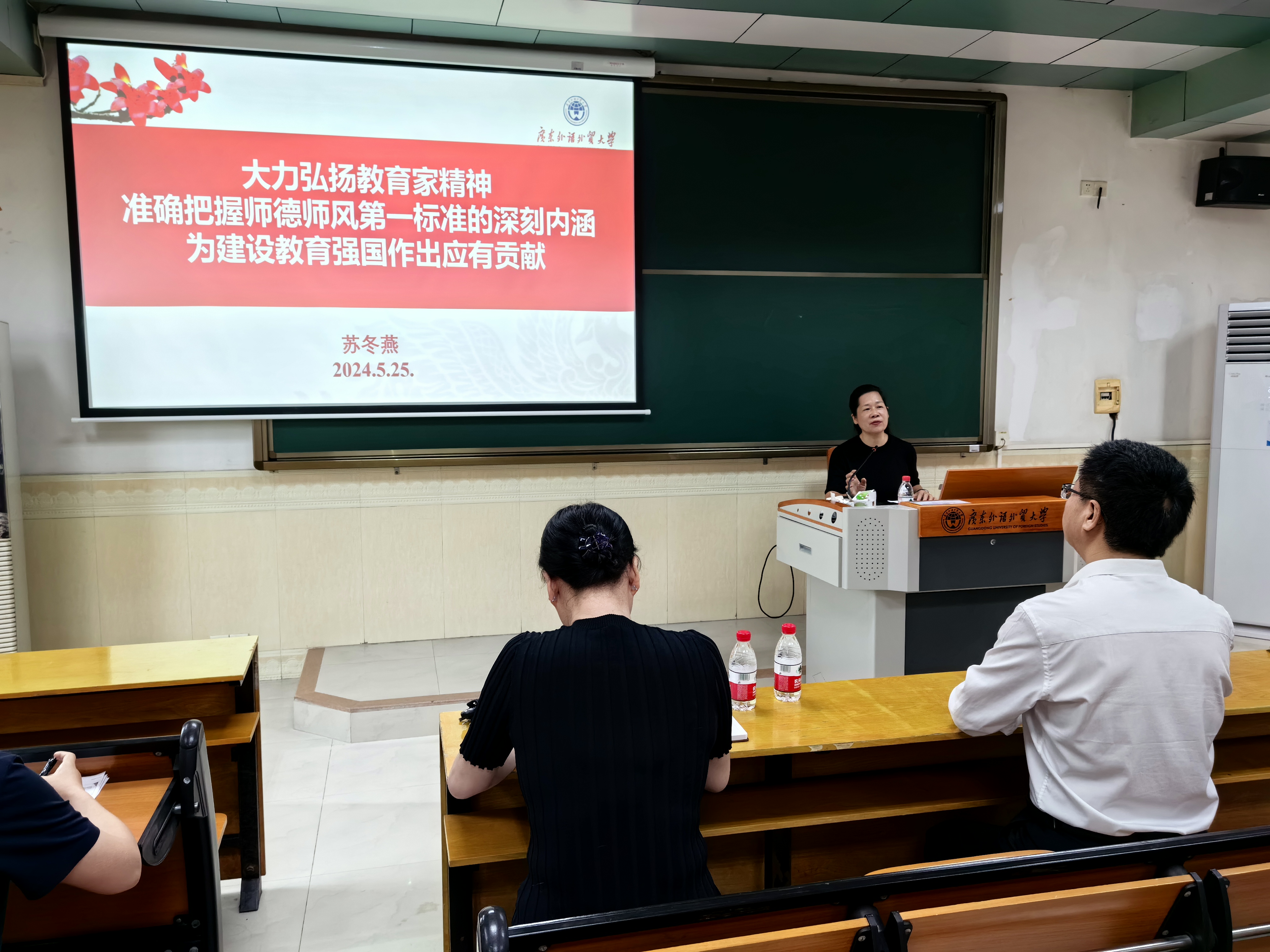 苏冬燕书记作《大力弘扬教育家精神 准确把握师德师风第一标准的深刻内涵 为建设教育强国作出应有的贡献》专题培训。苏冬燕带领全体教职工重温习近平总书记关于师德师风建设、教师队伍建设的重要论述,号召学院全体教师大力弘扬教育家精神,要精准把握师德师风的第一标准的深刻内涵,在教学和生活中保持战略定力、坚定理想信念,增强知识储备、改进教学方式,守护学生成长。