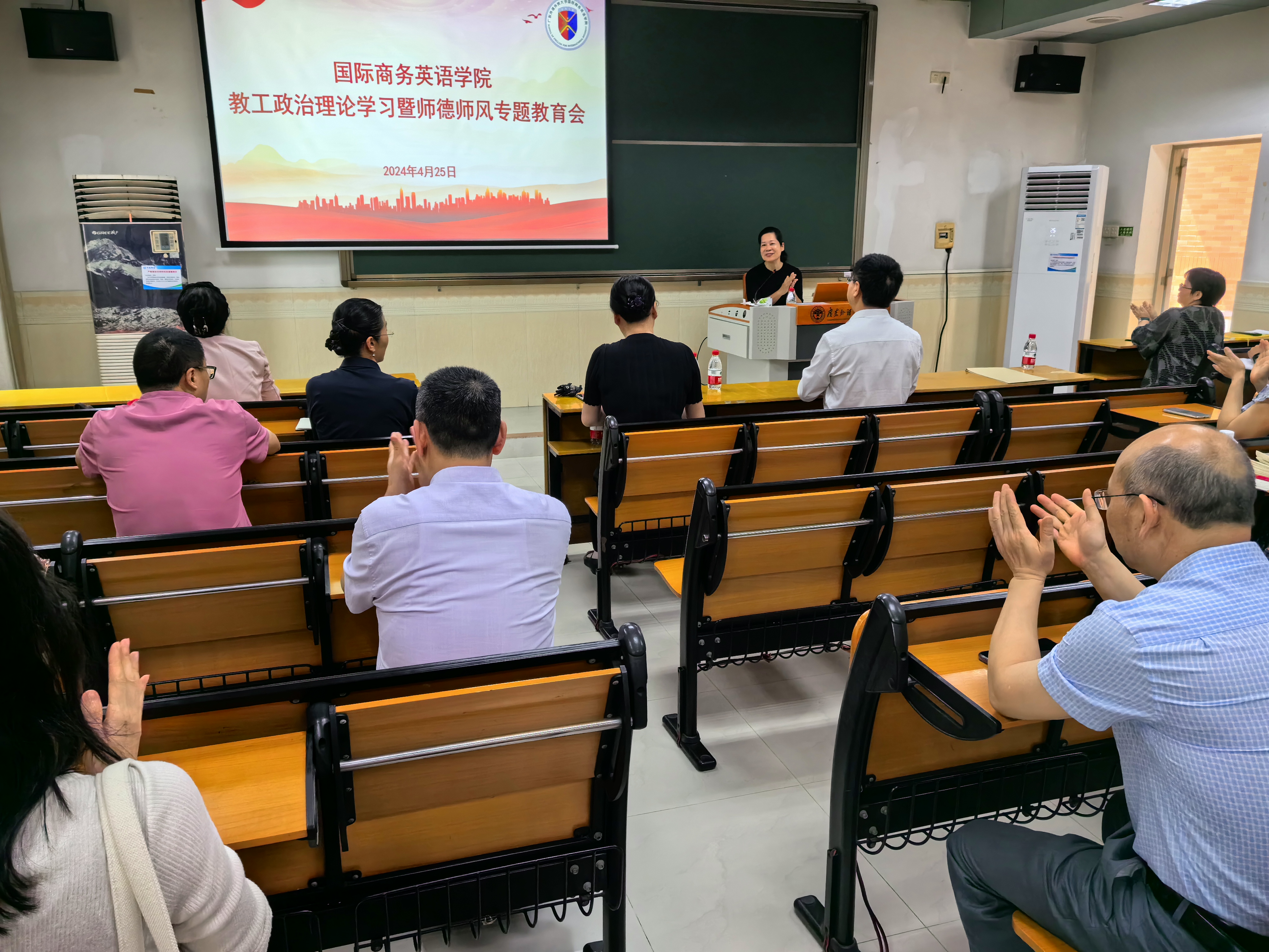 2024年4月25日下午,商英学院在四教424召开教工政治理论学习暨师德师风专题教育会。学院领导班子成员和全体教职工参加会议,会议由学院党委书记苏冬燕主持。