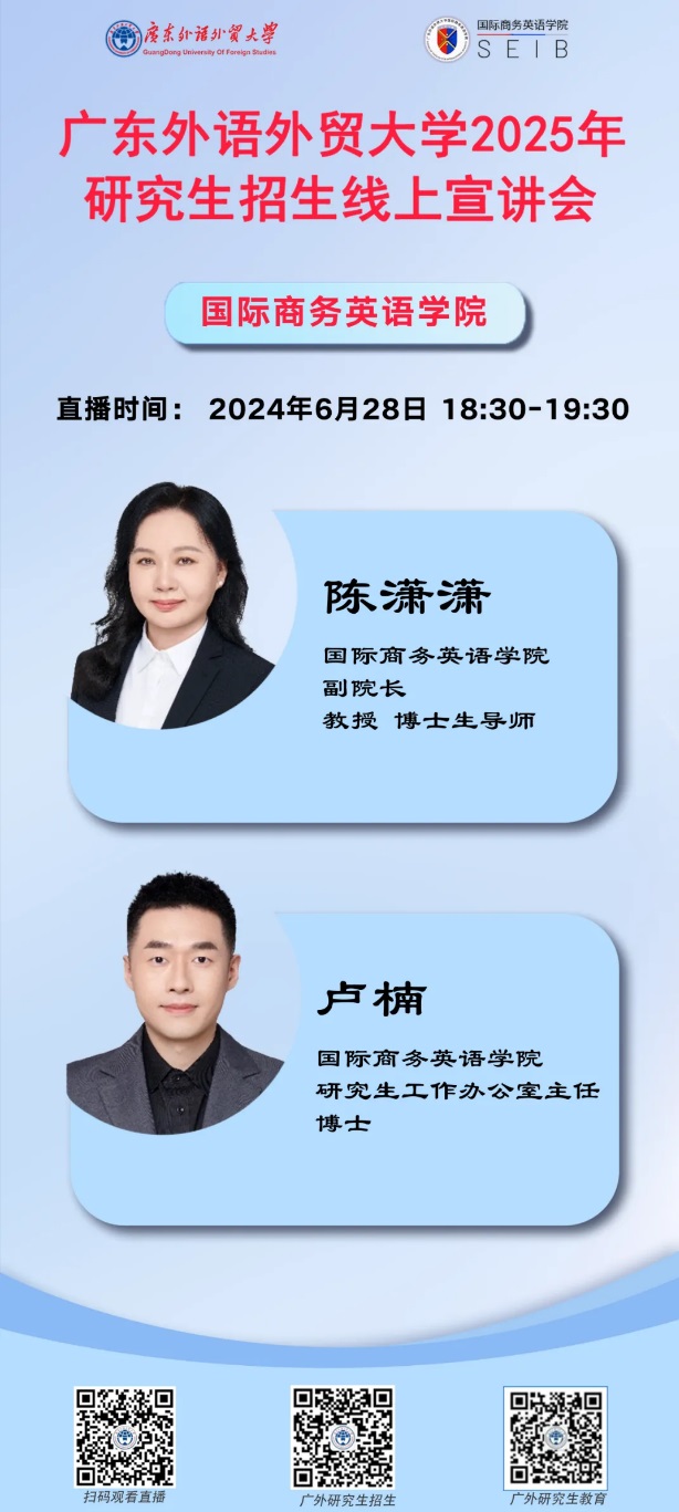 2024年6月28日18:30-19:30,在学校研究生院的大力支持下,广东外语外贸大学国际商务英语学院2025年研究生招生线上宣讲会顺利举行。