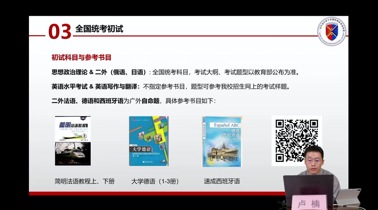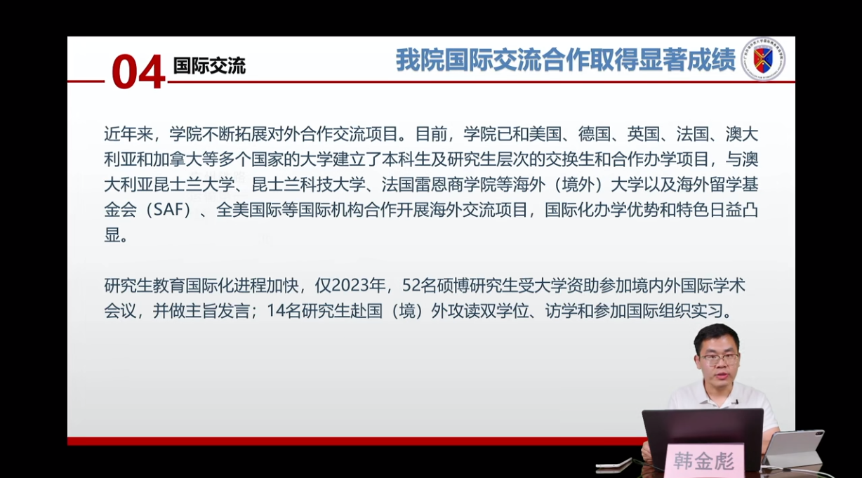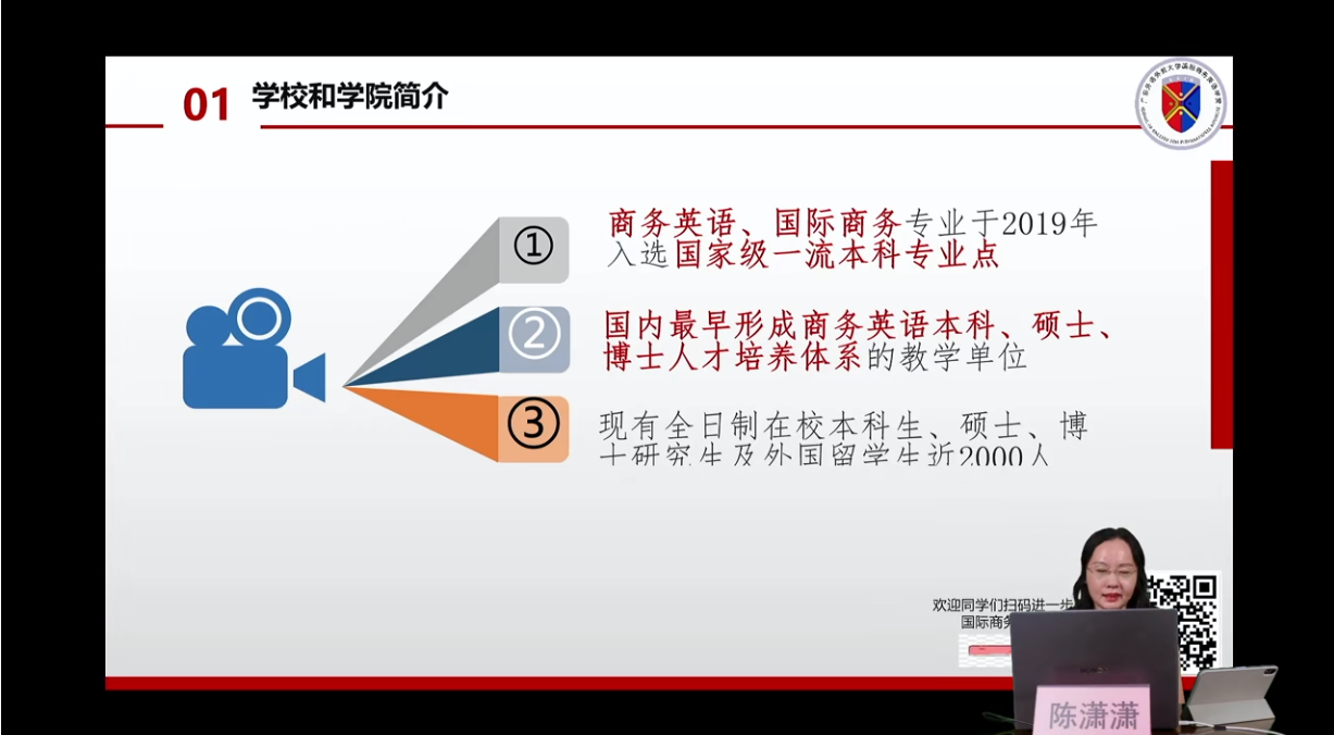 宣讲会由国际商务英语学院陈潇潇副院长主讲,研究生办公室卢楠主任、国际项目中心韩金彪副主任、在读博士生王良莉参与此次直播,从学科历史沿革、学科优势、师资队伍、培养特色、培养成效、毕业生去向等方面,对学院情况进行了全面的介绍。
