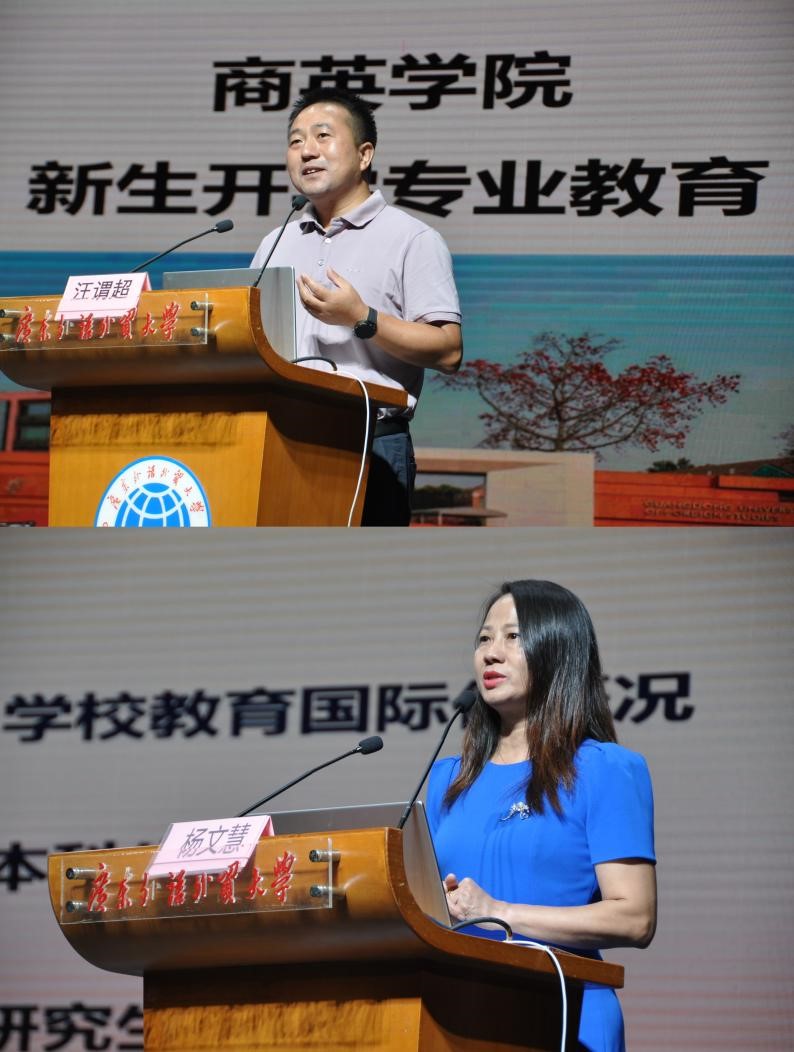 汪谓超副院长回顾了学院的发展历程,介绍了学院的学科优势、师资力量和学术成果。学院在今年首次加入了多个双学士学位本科项目,致力于培养复合型国际化商务人才。汪院在发言中也向新生们阐明了个人规划的重要性,希望这届新生在商英学院得到充分成长,度过美好的大学生活。杨文慧副院长介绍了商英学院的特色国际交流项目,希望同学们有机会可以出国进修深造,体验不同的人文风情和国外高校的教学模式,成为更好的国际化人才。