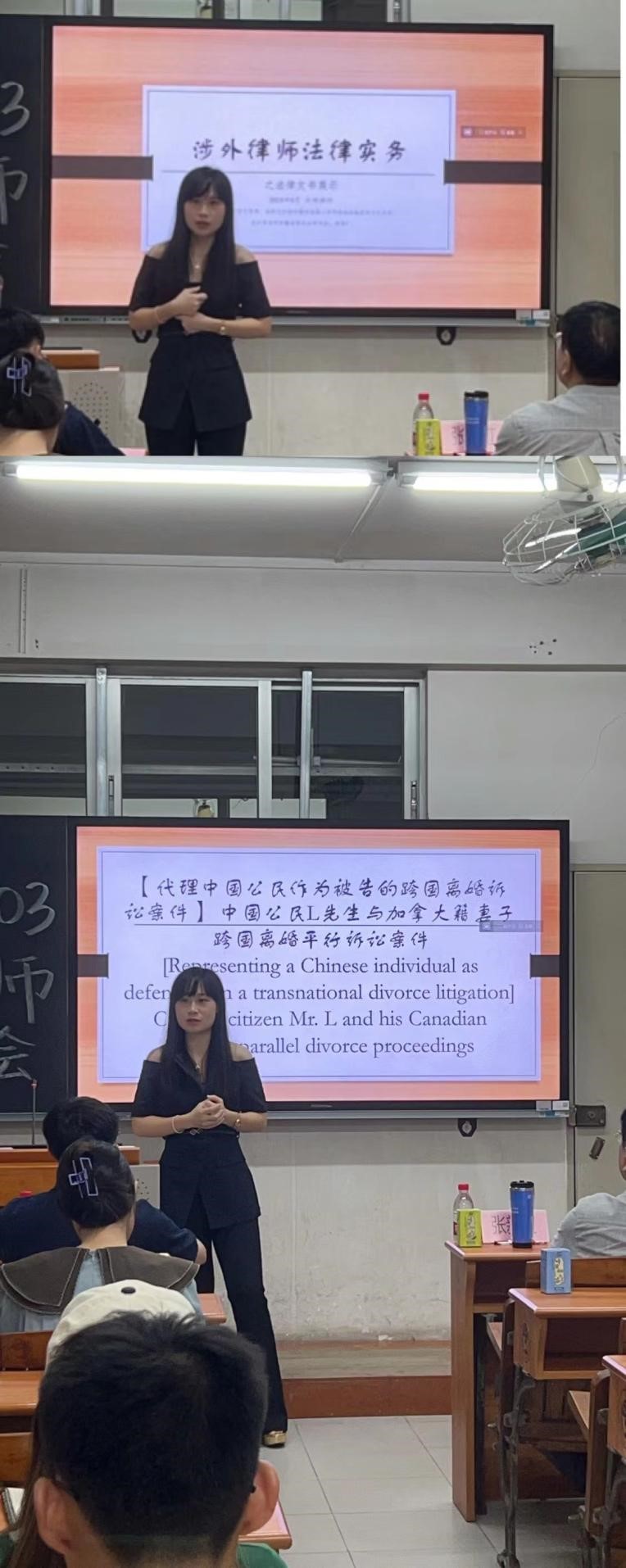 在校外导师分享环节,许琳律师对国家涉外法治人才培养计划、个人留学经历、法律英语未来的就业前景、涉外律师法律工作实务等内容进行了详细分享,通过引用实际工作案例,分析涉外法律工作中常见的问题,并借此机会向同学们分享成为涉外法治人才应具备的基本素质。