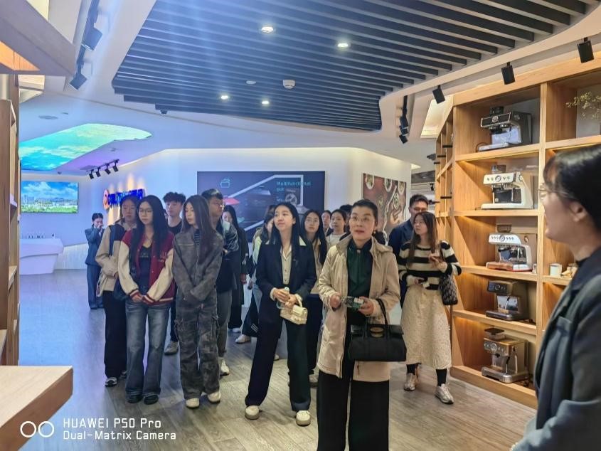 访问期间,邹丹介绍起公司概况,让师生们对广东新宝电器股份有限公司有了更为深入的认知。广东新宝电器股份有限公司自 1995 年创立以来,一路砥砺前行,逐步在小家电领域站稳脚跟,如今已然成长为行业内的领军“巨擘”。公司业务版图横跨厨房电器、家居护理电器、婴儿电器、制冷电器到个护美容电器等多元品类,精准覆盖全类目小家电产品,全方位满足消费者的各类生活需求。凭借着对品质的执着追求与持续深耕,新宝电器打造出多款爆款产品,备受市场青睐。在生产布局上,新宝电器极具战略眼光,早早布局三大生产基地,分别坐落于制造业底蕴深厚的顺德、产业资源丰富的滁州,以及具备地缘优势的海外印尼。三大基地联动配合、协同发力,构筑起高效生产网络,源源不断地向全球输送优质产品,夯实了企业坚实的产能根基。不仅如此,新宝电器手握多张“王牌”,构筑起难以复制的核心竞争力。也正因如此,公司得以连续多年在出口总量榜单上独占鳌头,稳居行业第一把交椅,成为中国小家电企业走向世界舞台的闪耀名片。