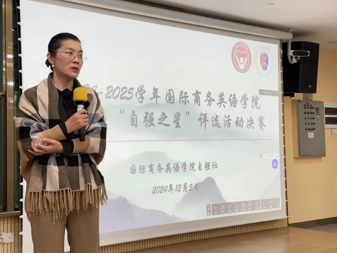为选拔出在学术、公益、实践等方面有突出贡献的优秀商英学子,鼓励同学们积极奋进,满怀热情地参与到学术、公益和实践活动当中,12月5日下午,商英学院第二届“自强之星”决赛在一教南215思明讲堂顺利举行。学院党委副书记杜焕君、辅导员万东方、赖志鹏以及高翻学院辅导员孟令怡出席此次活动并担任比赛评委。