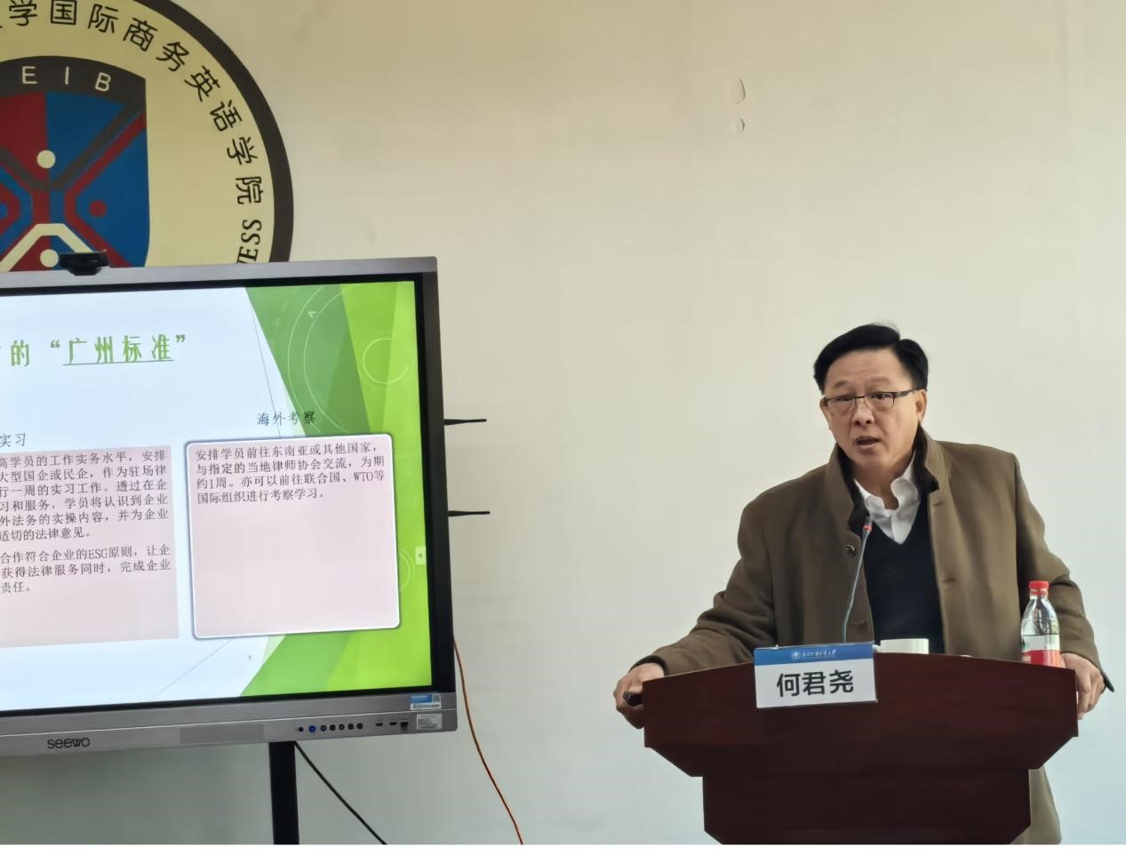 胡春雨院长致欢迎辞,对何君尧律师莅临指导表达感谢。胡院长介绍了学院的发展历程、学科建设、专业设置等情况,重点解读了学院在专业深度交叉融合、国际化办学等方面的特色。胡院长指出,商英学院培养能够“讲好中国经济故事,服务大湾区出海”的涉外法律服务人才,表达了对涉外法律服务人才培养的美好期望。