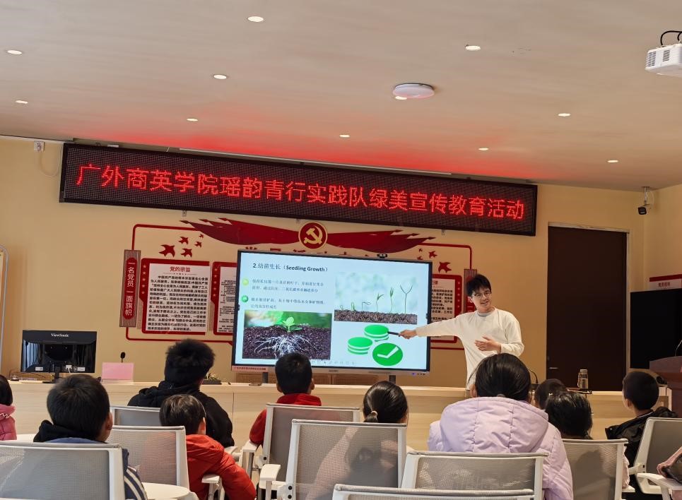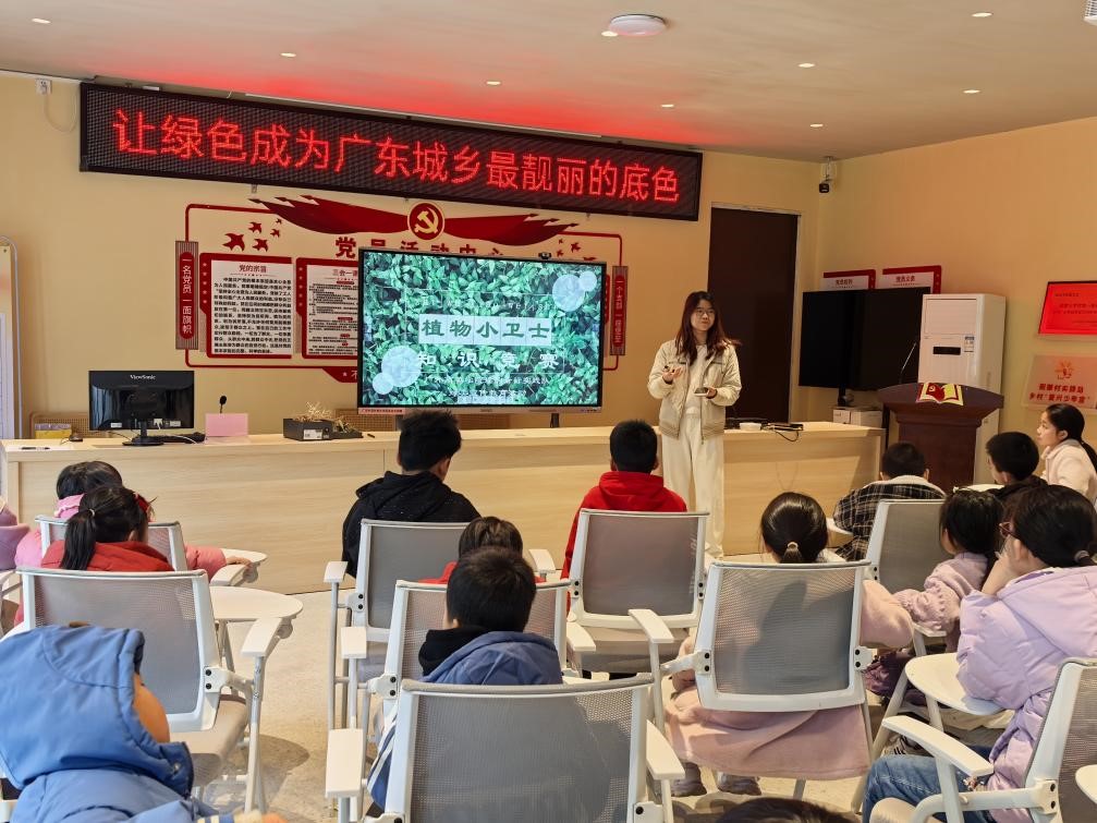 在“绿植知识小课堂”上,队员用图文并茂的PPT讲解植物生命周期,形象诠释植物“循环往复、生生不息”的意蕴,其中穿插趣味问答,而孩子们也踊跃参与互动——“我知道!种子发芽需要水、空气和阳光!”一名男孩抢答成功,赢得了在场一片掌声。在“植物小卫士”知识竞赛环节,孩子们根据前面学习内容,结合自身知识储备,争相回答绿植养护与生态环境保护方面的题目,现场气氛十分热烈。