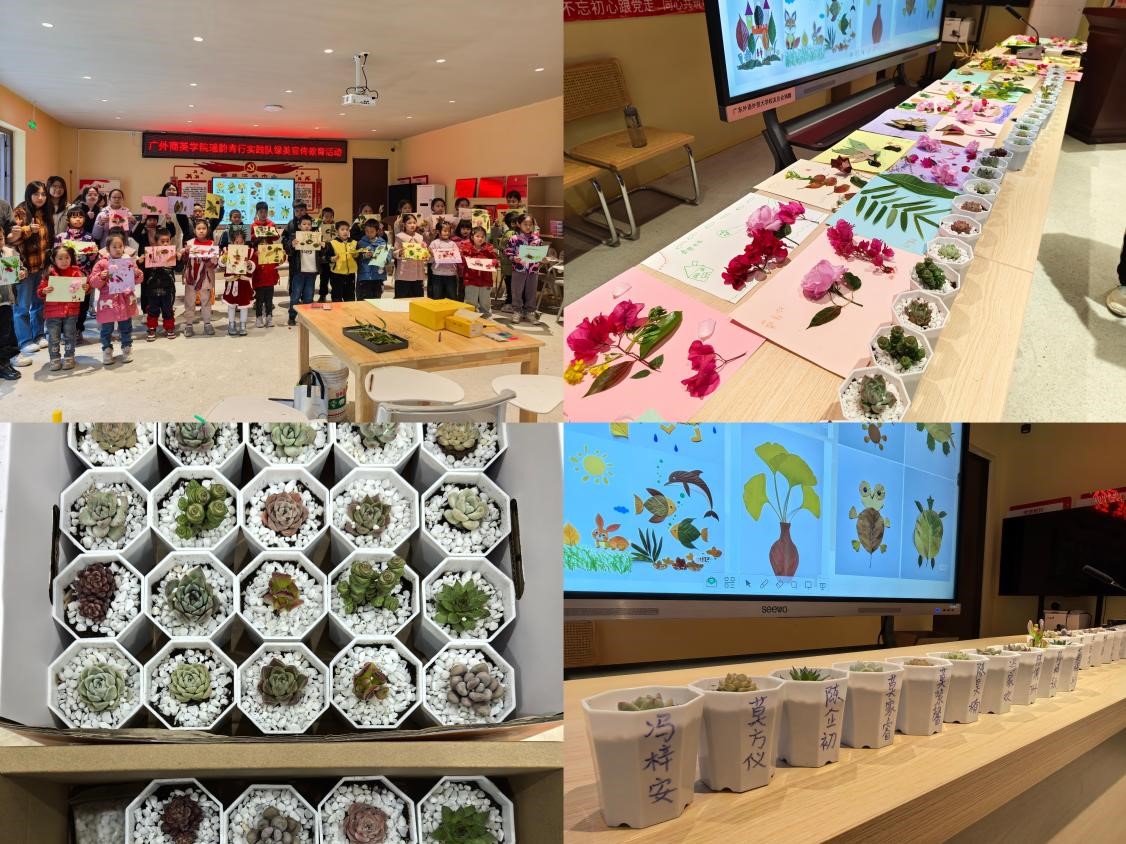活动尾声,团队为孩子们送上了队员们亲手种下的多肉绿植,小朋友们开心地收下了这份珍贵礼物,纷纷和队员分享今天的收获:“我学会了以后给植物浇水要适量”“原来叶子还能做成画,植物确实在我们生活中有很多作用”……当孩子们把多肉带回家装饰窗台,当他们在作文里写下“每一片落叶都该有第二次生命”,“绿美广东”的种子已然在童声中扎根萌芽。