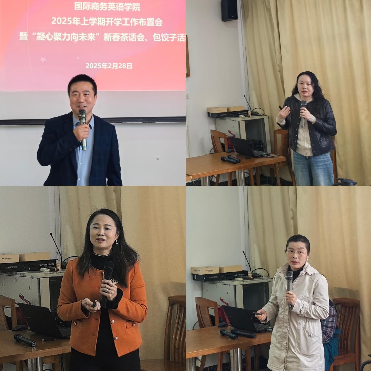 汪谓超副院长、陈潇潇副院长、杨文慧副院长、杜焕君副书记分别就本科教学工作,研究生教学科研工作,国际交流、行政和财务工作以及学生工作等方面作了汇报和布置。法律英语系主任张新红、国际商务系主任康蕾、英语教学部主任严小庆、经贸英语系主任何宇菲、商务英语系主任林洁依次汇报了系部新学期工作设想,提出加强专业内涵建设、提升人才培养质量的相关举措。