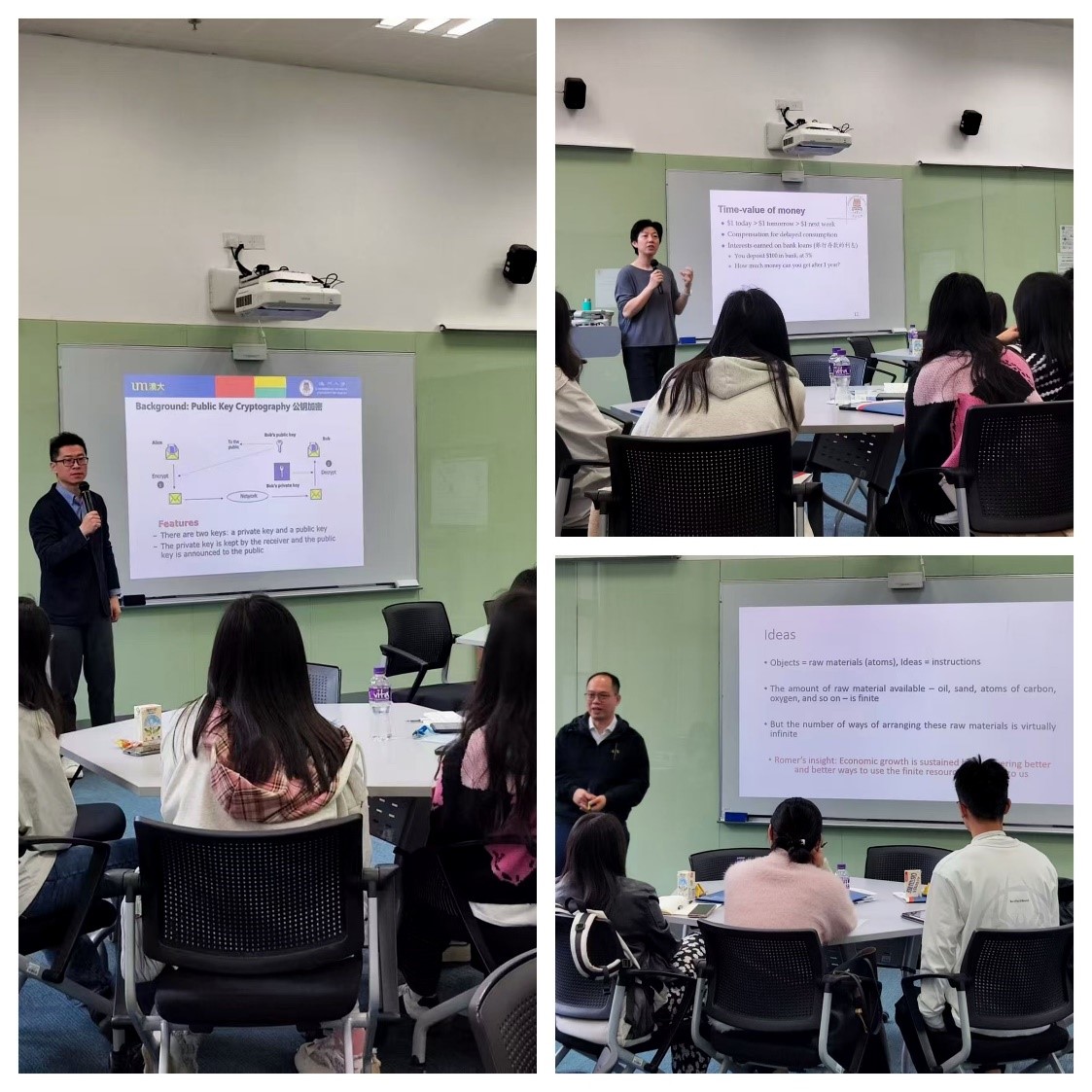 来自香港大学和澳门大学的老师们为同学们带来了多场主题讲座。香港大学Leung Wayne博士以绿色金融和ESG为主题,深入讲解绿色金融和ESG的定义、优缺点及案例,并从个人、公司和政府三个角度提出可行性建议。澳门大学任锦娟教授分享“金融科技”知识。课堂以“骰宝”游戏引入,帮助大家区分投机和投资,介绍金融产品、大数据和金融工程等知识,让大家体验到不同语言环境下的教育风格。澳门大学杨毅柏教授讲解“创新如何驱动经济增长”,他以自己的学术论文为依据,从目的出发,阐述创新驱动经济增长的路径,并提出“创新如何改变我们对富有和贫穷国家经济增长的看法”这一发人深省的问题。澳门大学林龚教授用生动形象的语言讲解“区块链”知识,激发了学员们的学习兴趣。课程结束后,学员们分为三组,以金融与科技为主题进行总结展示,汇报学习成果,澳门大学杨毅柏教授分别进行点评。