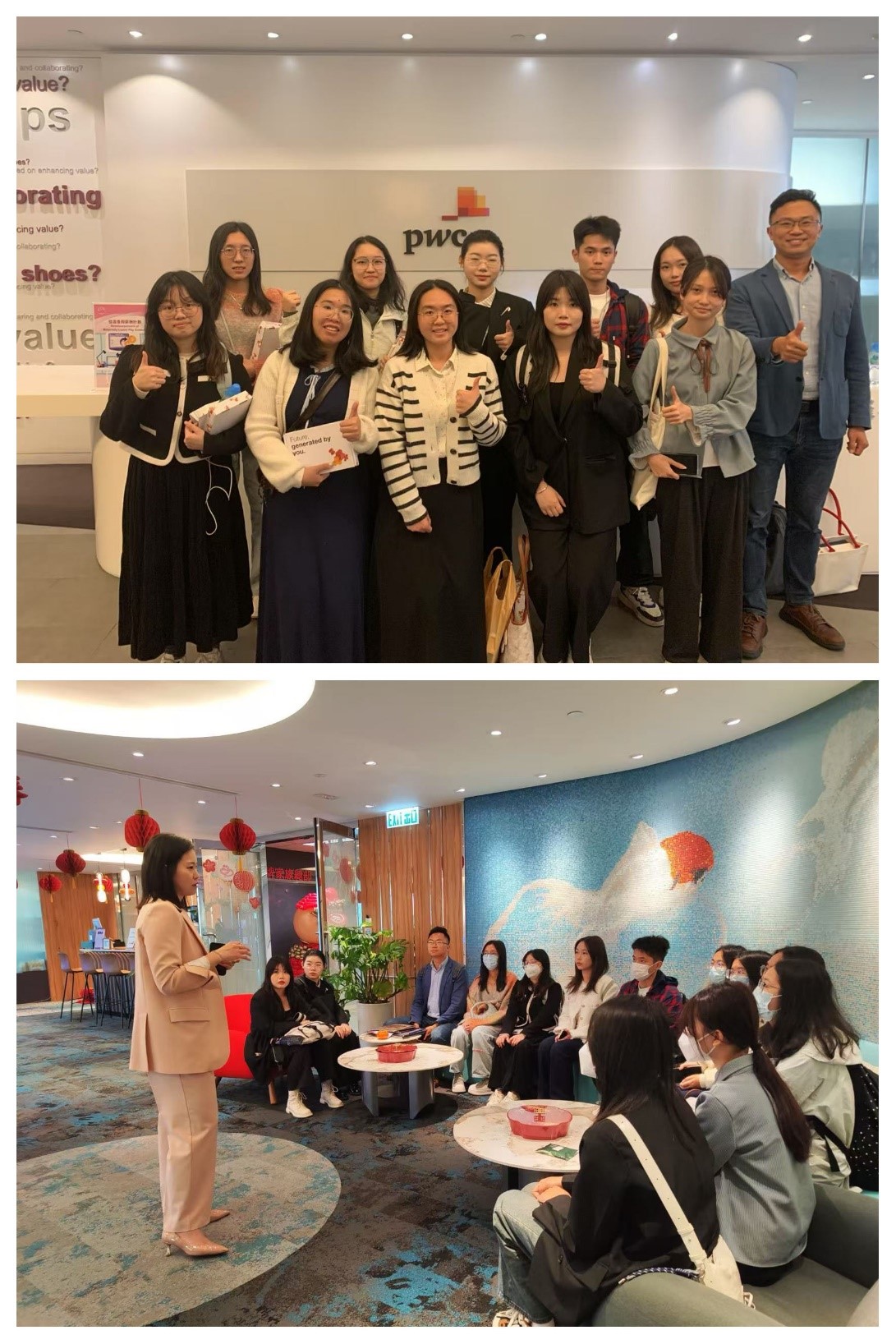 在专业课程之外,冬令营项目还安排全体学员赴香港友邦保险、普华永道(香港)两家公司参访学习。2月17日上午,香港友邦保险王牌家族高级经理、我校商英校友2008级校友许丹带领全体学员参观了友邦保险公司,全面介绍了香港全球金融中心的作用以及保险行业优势。她分享了自己从青涩大学生成长为保险行业专家的经历,对比了内地和香港的保险业,让同学们对保险行业有了更深刻的认识。当天下午,学员们与香港本地高校及印度尼西亚的大学生一起参加了普华永道(香港)的企业开放日。普华永道(香港)的合伙人、高级经理分别分享了审计、税务、风控等不同部门的工作内容、工作理念及工作体会,加深了学员们对会计师事务所的理解。