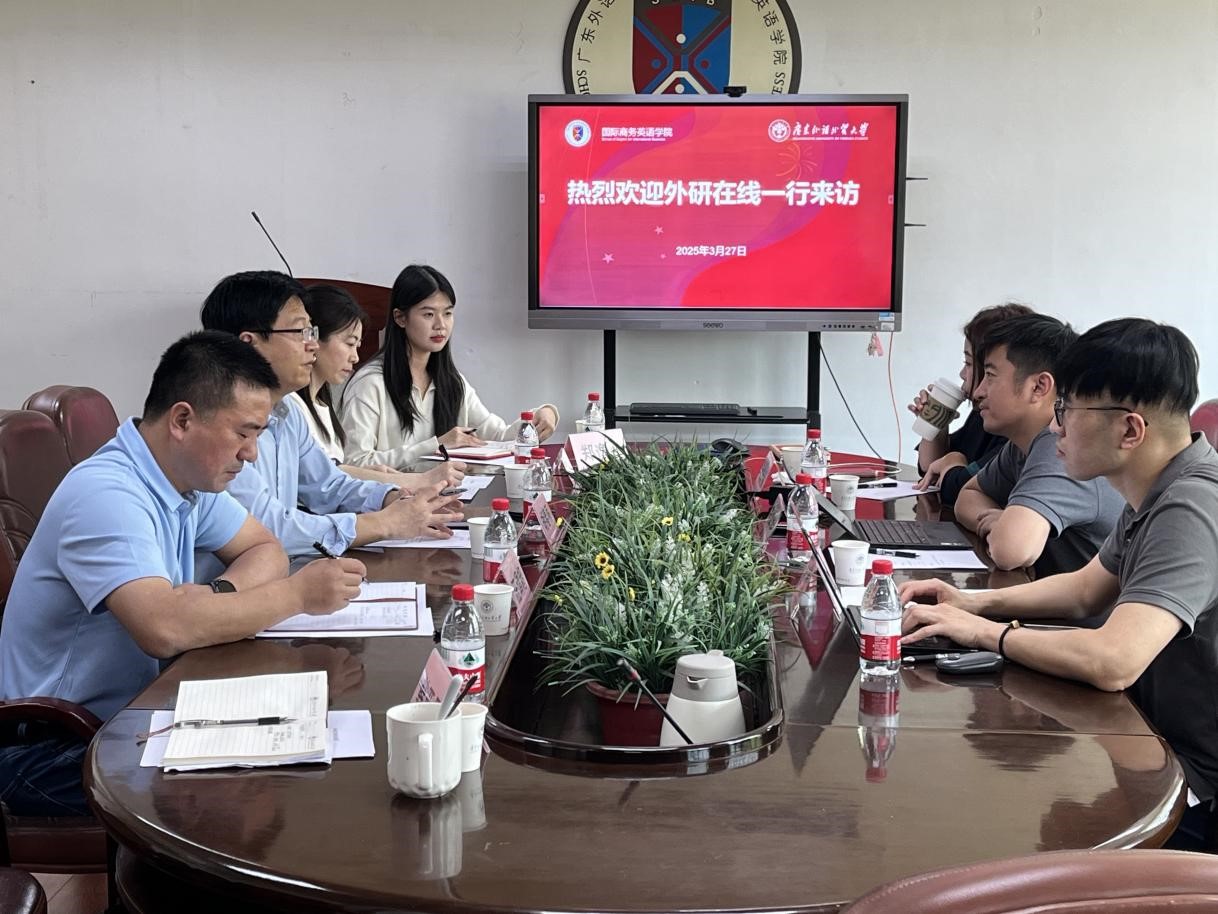 3月27日下午,北京外研在线数据科技有限公司(以下简称“外研在线”)总经理商其坤、产教融合部总监王磊以及广东地区市场经理龙垚垚一行来访我院,就如何深化合作、协同培养适应时代需求的高素质人才进行了深入探讨。商英学院院长胡春雨、副院长汪谓超、英语教学部系主任严小庆等人员参与座谈。