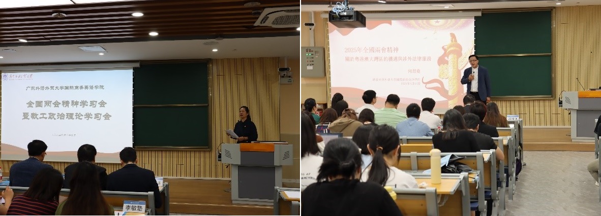 4月10日下午,商英学院在一教桃李讲堂成功举办全国两会精神学习会暨教工政治理论学习会,邀请了第十四届全国政协委员、香港立法会议员、国际公益法律服务协会主席何君尧大律师为学院师生开展了“2025年全国两会精神——关于粤港澳大湾区的机遇与涉外法律服务”的专题讲座。校党委常委、副校长谢伟光,国际公益法律服务协会秘书长吴毅荣、行政主任潘锦洋等出席会议,商英学院领导班子以及师生代表参加会议。会议由学院党委书记苏冬燕主持。