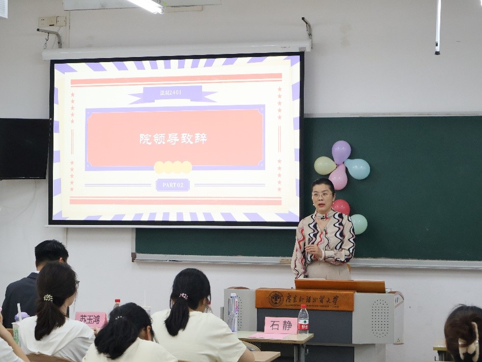 2025年4月17日下午,商务英语(法学双学士学位)2401班(以下简称“法双2401班”)“四导一体”见面会在六教B308教室顺利举行。商英学院党委副书记杜焕君、法双2401班校外导师苏玉鸿、班级导师石静及2024级本科生辅导员陈思蓓出席此次会议,法双2401班全体同学参与此次见面会。