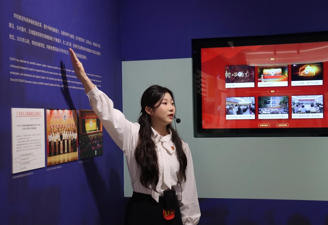 展示结束后,苏冬燕书记和王鲜萍副馆长先后致辞。苏冬燕书记在总结致辞中强调,面对复杂的国内外形势,我们不能忘记历史,要从党史校史学习中汲取奋进力量,转化为推动进步的实际行动,并对参赛选手和观众提出了三点希望和要求:一是要铸“忠诚之魂”,做理想信念的传承者。要忠诚于党、矢志报国、艰苦奋斗,用信仰之光照亮前行之路,在传承红色基因中续写‘学贯中西不忘本,扎根中国向世界’的忠诚答卷。二是要扬“广外之志”,做敢为人先的创新者。要敢闯敢试、敢为人先、迎难而上,以‘闯’的锐气、‘创’的智慧、‘干’的担当,在服务“一带一路”倡议和粤港澳大湾区建设的最前沿勇当探路先锋。三是要提“奋进之能”,做伟大事业的建设者。要胸怀天下、勇担使命、开拓进取,以“不务虚功,但求实效”的实干作风,在强国建设、民族复兴的赛道上跑出广外人的加速度。