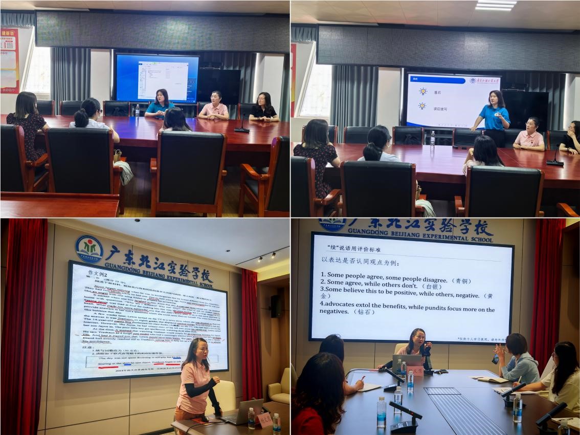 此外,为助力中学英语教师丰富教学理论、提升教学实践效果,杨文慧和乐思伟分别为广东北江实验学校、南雄中学英语教师开展了高考英语备考专题讲座,着重分享了高考英语“读后续写”提分技巧,并详细剖析了续写理论以及评价标准,同时结合自身教学实践和学生写作案例,提供了针对性的续写提分技巧以及建议,会后老师们积极交流讨论,取得了良好成效。