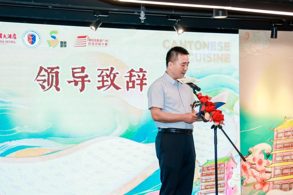 开场致辞环节中,商英学院汪谓超副院长强调选手们的每一次讲解都是对广州历史文化的一次传承和创新,每一个表达都是向世界讲述中国故事的一次机会,保护传统名菜更需要年轻一代的热情与参与,并给予青年无限期望。