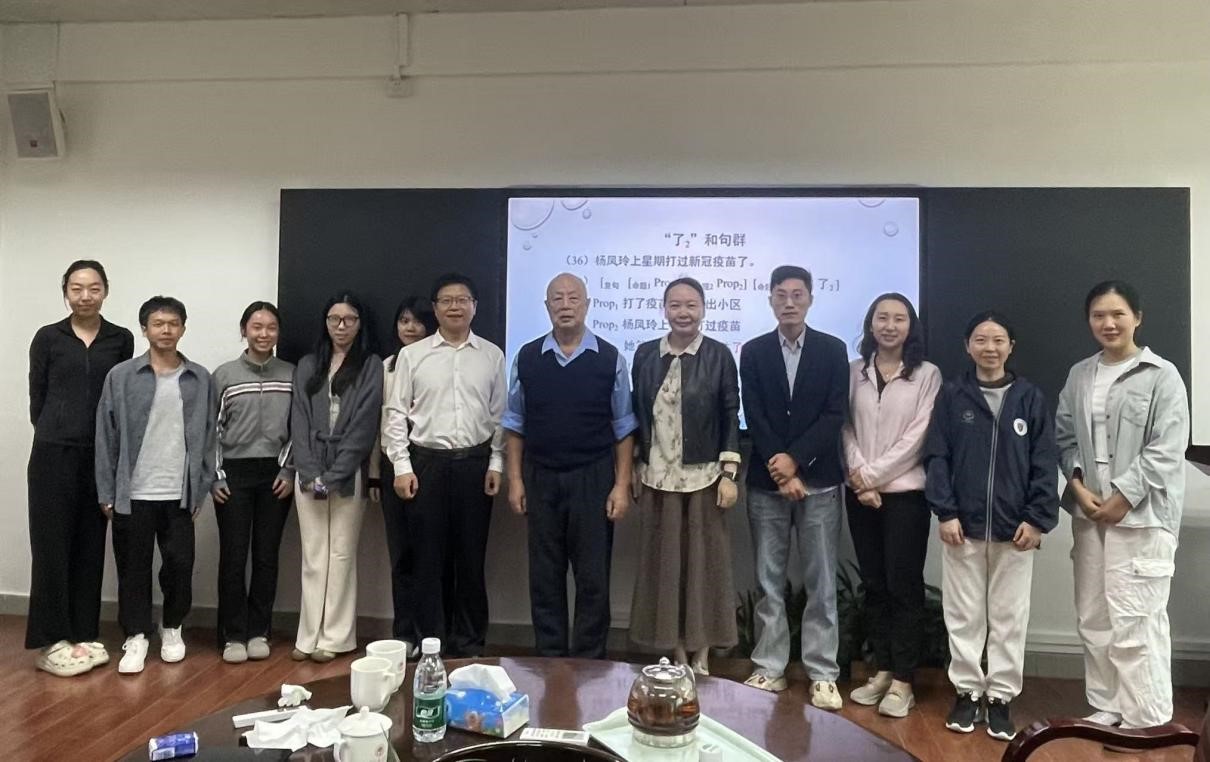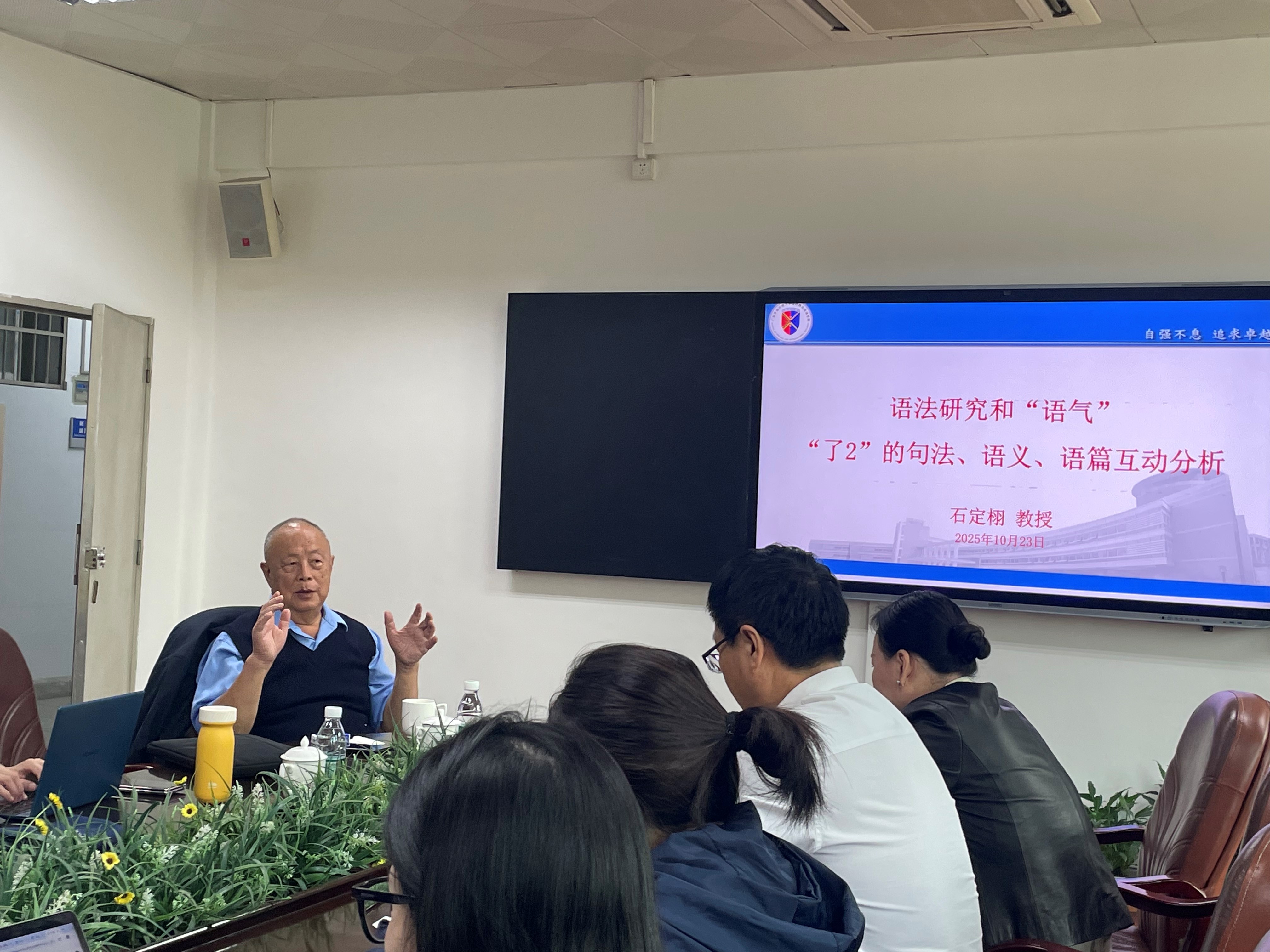 2025年10月23日15:00-17:00,著名语言学家、云山领军学者石定栩教授在第三教学楼318会议室,为我院师生带来了关于 “了2”的句法、语义、语篇互动分析的精彩分享。商英学院院长胡春雨、副院长陈潇潇、教师代表及硕博研究生到场聆听参与。