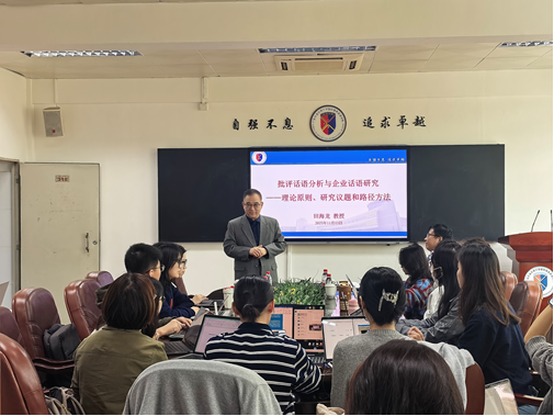2025年11月13日下午2:30,广东外语外贸大学商英学院于白云山校区第三教学楼318室举行了“批评话语分析与企业话语研究——理论原则、研究议题和路径方法”为主题的讲座。本次讲座由中国语言学会社会语言学分会名誉会长、中国英汉语比较研究会话语研究专业委员会秘书长和副会长、中国石油大学(北京)特聘教授田海龙教授主讲,国际商务英语学院院长胡春雨教授主持。商英学院研办主任卢楠、系主任何宇菲、教师代表及硕博研究生到场参与学习。