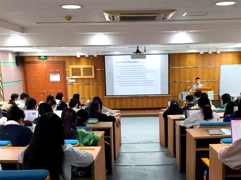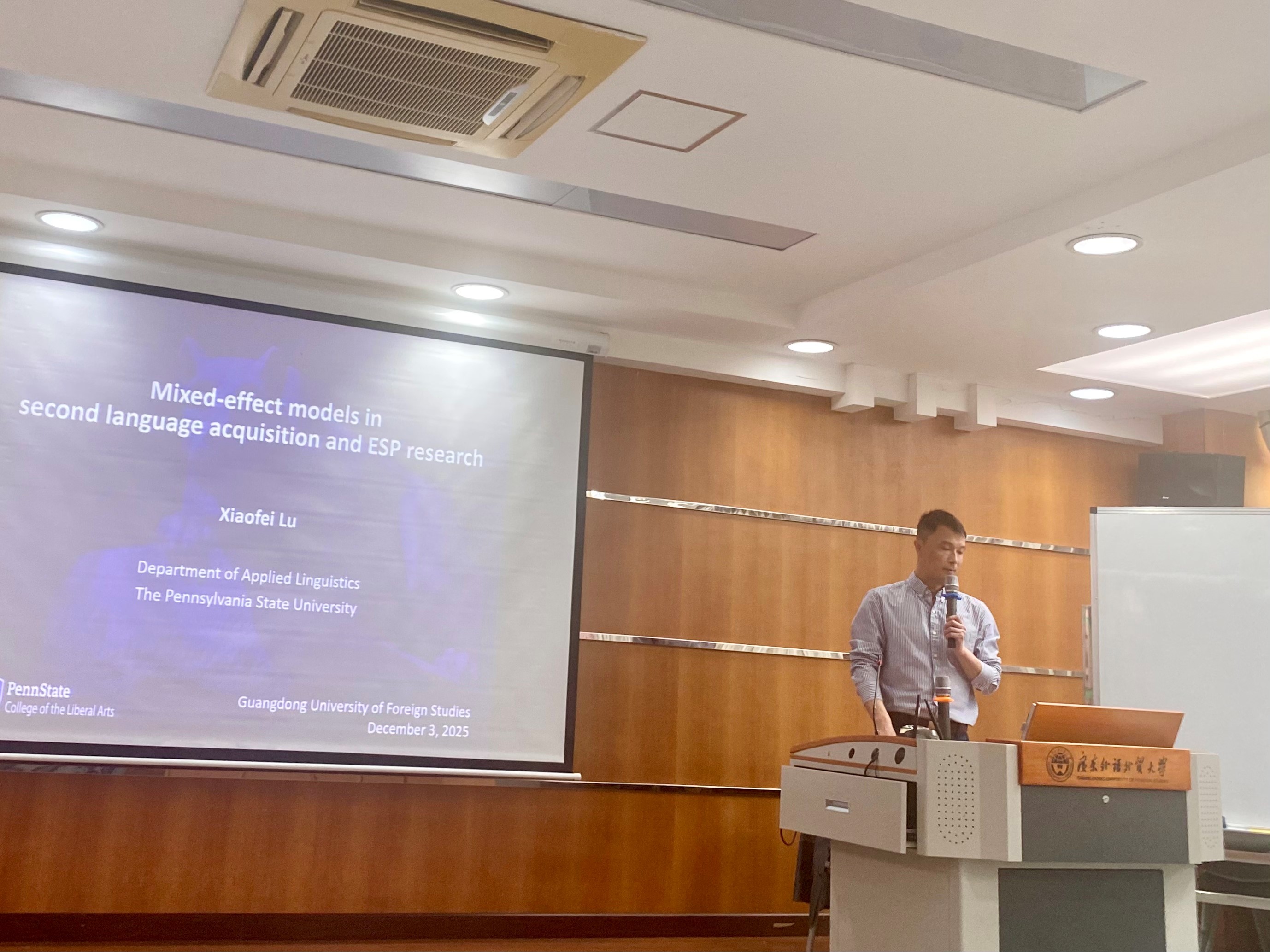 2025年12月3日下午,美国宾夕法尼亚州立大学应用语言学系陆小飞教授应我院邀请,在白云山校区第九教学楼MBA中心203室作题为“Mixed-effect models in second language acquisition and ESP research”的学术讲座。讲座由许琪教授主持,陈潇潇副院长、王伟强副教授、陈丽丹副教授、以及中山大学洪炜教授等校内外众多师生参与了本次学术活动。