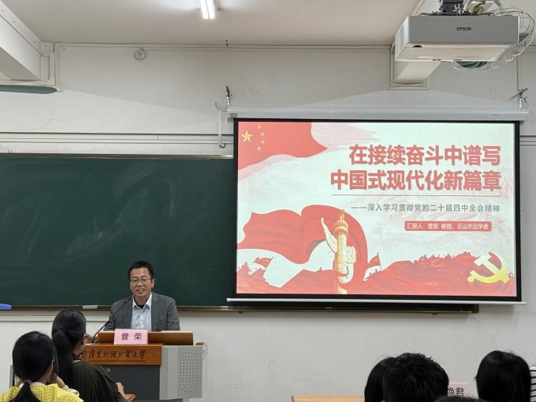 曾荣教授以“在接续奋斗中谱写中国式现代化新篇章”为主题,围绕党的二十届四中全会精神展开系统阐释与深度解读,讲座内容层次分明、逻辑清晰,从“深入领会全会的重大意义”“系统掌握全会的主要内容”“践行全会精神的根本要求”三大核心板块展开。一是从“为中国式现代化发展承前启后”“澎湃动能铸就硬核发展实力”“对全球发展贡献突出且多领域领先”三个维度,生动阐释了党的二十届四中全会的重大意义,让在场师生深刻认识到全会的重要作用。二是从“以经济建设为中心”“以改革创新为根本动力”“扩大高水平开放”“以推动高质量发展为主题”“必须牢牢把握共同富裕本质要求”“加快高水平科技自立自强、引领发展新质生产力”六个核心维度,拆解了全会部署的关键任务,引导师生系统掌握党的二十届四中全会的主要内容。三是围绕“践行党的二十届四中全会精神的责任要求”展开系统阐释。即要在“学深悟透”上达到新高度,争做政治上的“明白人”;要在“攻坚克难”上体现新担当,争做发展上的“开路人,要在“自我革命”上树立新标杆,争做作风上的“干净人”。