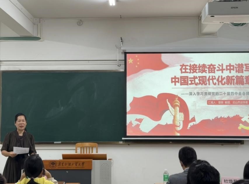 为深入学习贯彻党的二十届四中全会精神,引导师生准确把握全会核心要义与实践要求,切实把思想和行动统一到全会精神上来,12月11日下午,我院组织开展学习贯彻党的二十届四中全会精神宣讲会。本次宣讲会由学校马克思主义学院副院长曾荣教授(云山杰出学者)担任主讲人,学院党委书记苏冬燕主持会议,学院党委委员、党支部书记、教师代表及学生入党积极分子等参加学习。
