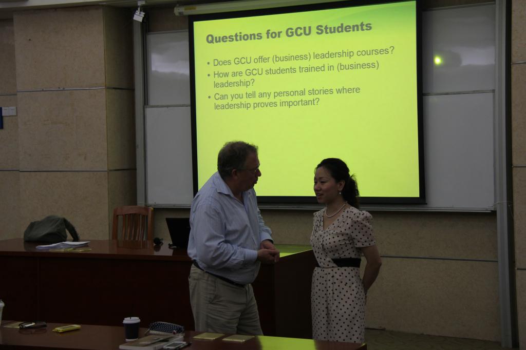 研讨会由沈璐老师主持。沈老师介绍了领导力的作用,回顾了《综合商务英语》课上有关领导力的学习内容。接着由袁慰心等五位同学做了有关非权力领导力对小组表现的影响的报告。报告之后,来自GCU的学生从各个角度踊跃提问,创新班学生从研究性学习实际情况和自身经历一一作答。