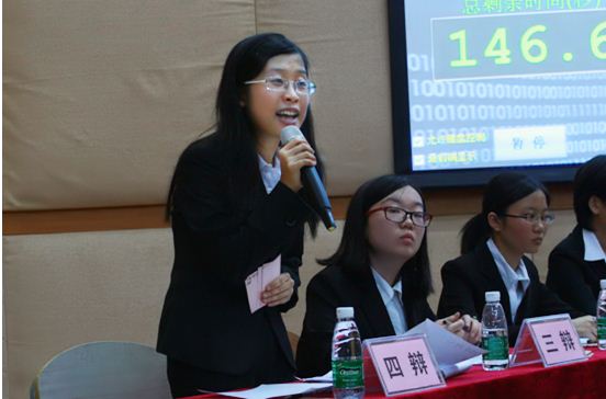 比赛最后的结辩环节,我院扣回立论,再次强调了评判标准和几个基本理论。首尾照应,有理有据,给台下观众留下深刻印象。四位辩手才思敏捷、妙语连珠,赢得阵阵掌声。
