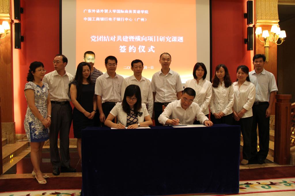 2013年7月1日,商英学院与中国工商银行电子银行中心(广州)党团结对共建暨横向项目研究课题签约仪式在北校区贵宾厅举行。工商银行电子银行中心(广州)副总经理张敬华、副总经理陈强,我校副校长许国彬,组织部部长方迎生,校团委书记谢秀兰,商英学院院长郭桂杭、党委书记车小真等出席了签约仪式。