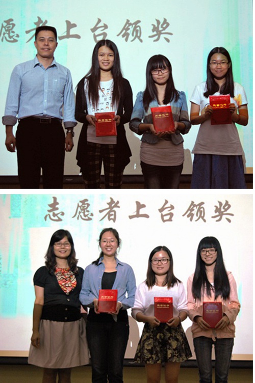 本网讯 11月6日19时,商英学院第二届志愿者文化节开幕式暨志愿者表彰大会在图书馆负一层报告厅举行。出席本次大会的嘉宾有校团委副书记陈兵、图书馆霍建梅老师、国际商务英语学院党委书记车小真、党委副书记张林茂、团委书记陈娓及各年级的辅导员老师。